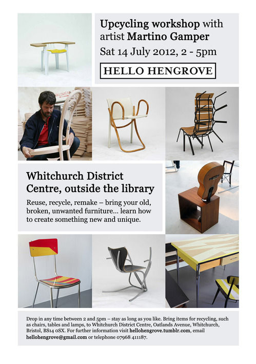 Martino has been selected to work with Hengrove residents on the Archive of Ideas, a flexible display structure, and as part of his work will be offering this opportunity to reuse, recycle and remake broken and unwanted furniture into new and unique objects. Bring items for recycling such as chairs, tables and lamps.