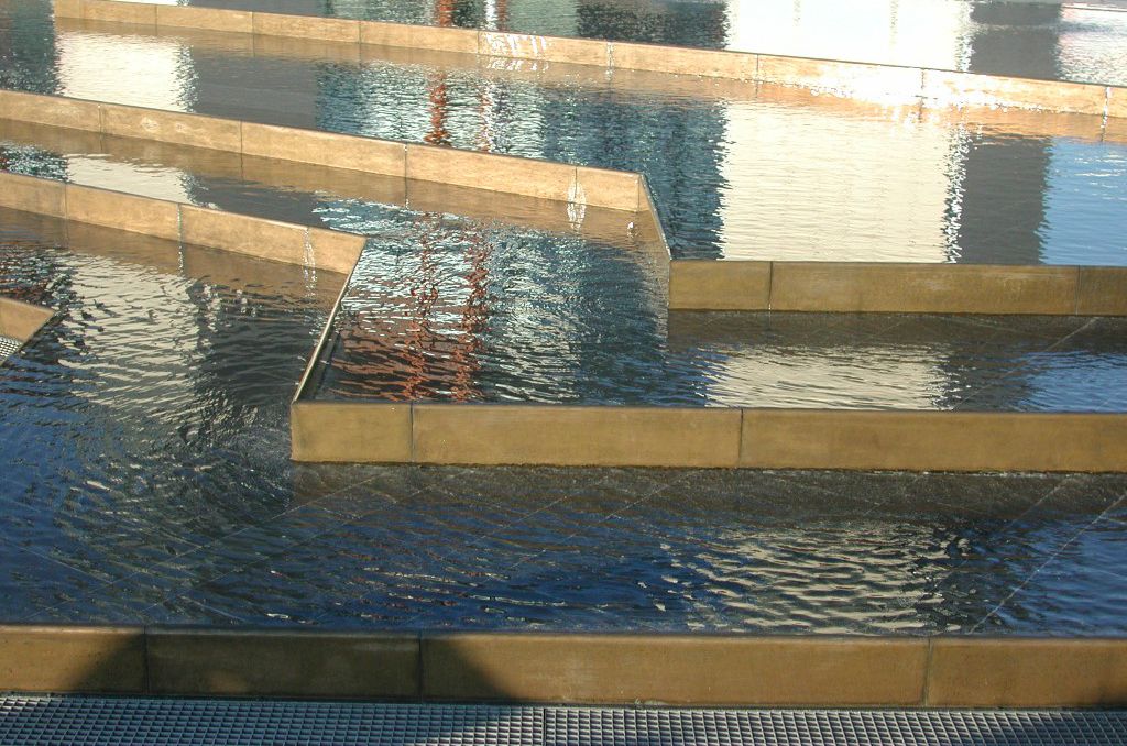 As the square was to be used for performances, Pye developed a series of water terraces, which creates areas of complete calm within this urban environment. When required for special events, one of the terraces can be drained to create a circular stage where performers are surrounded by water, which is held in place on the other tiers of terracing.