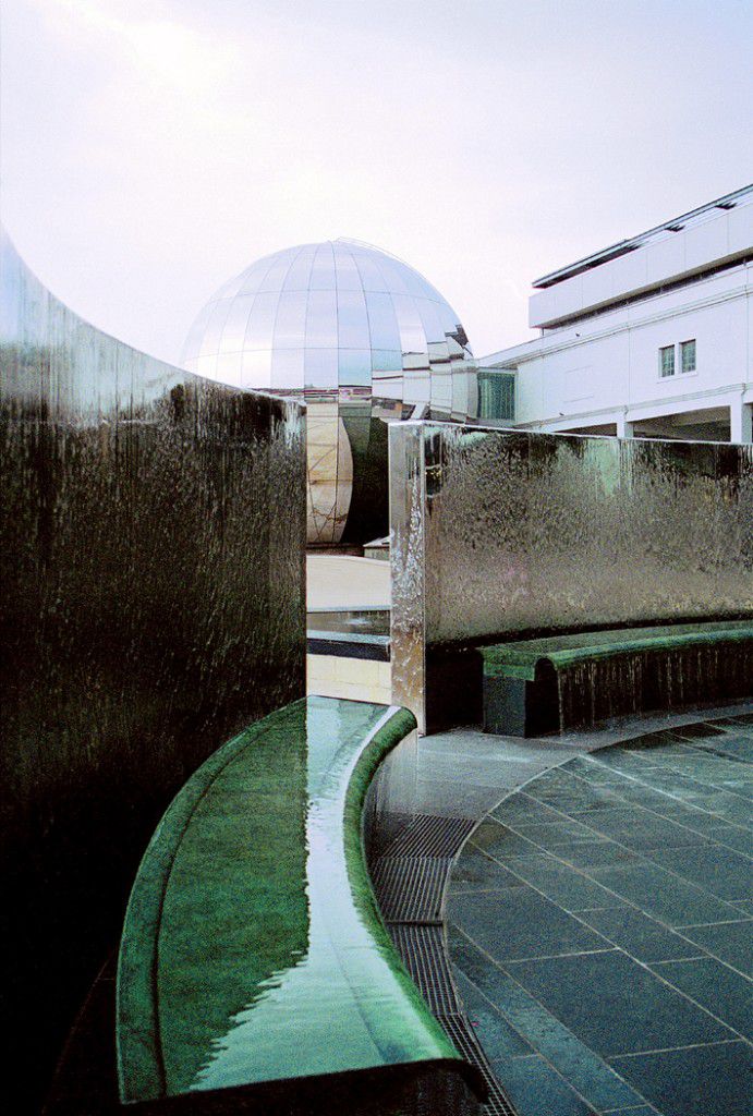 Canyon at the south end of the square forms a counterbalance for the water wall at the other end. Water flows in roll-wave patterns over two prism-shaped monoliths of mirror-polished stainless steel. Pye has positioned these face to face, creating a narrow canyon which people can just move through without being drenched.
