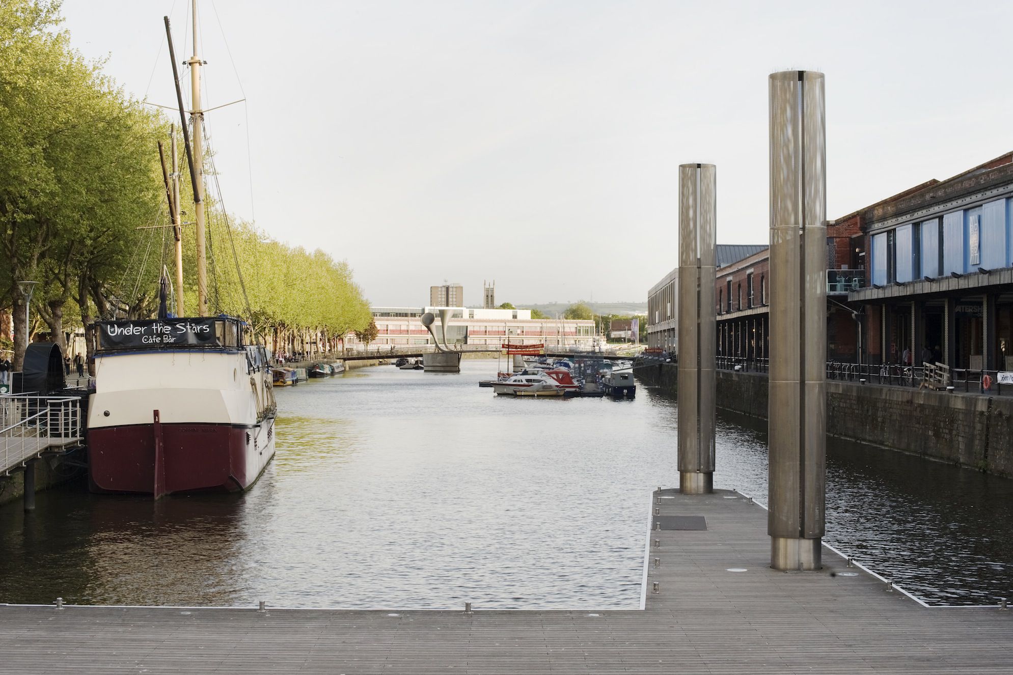 Ten tripartite perforated steel beacons set among fountains, commissioned by Bristol City Council as part of a £4m harbour-side regeneration project. When lit internally, the beacons lose all materiality and become translucent bodies of light.