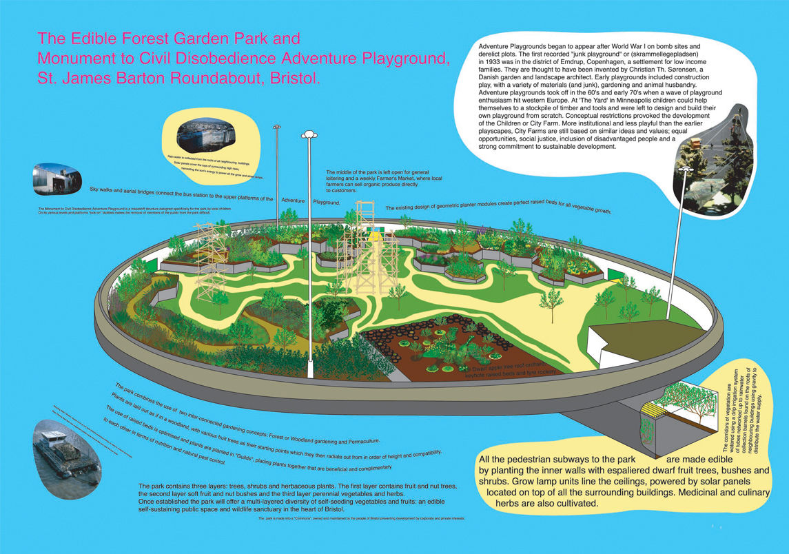 Edible Playscape was an art proposal by Nils Norman for the City Centre roundabout, St James Barton. The roundabout, which is characteristic of post war city centre redevelopment, is an open area sunken below a network of highways
