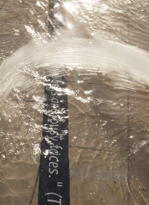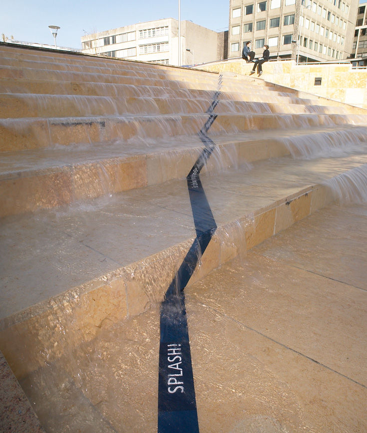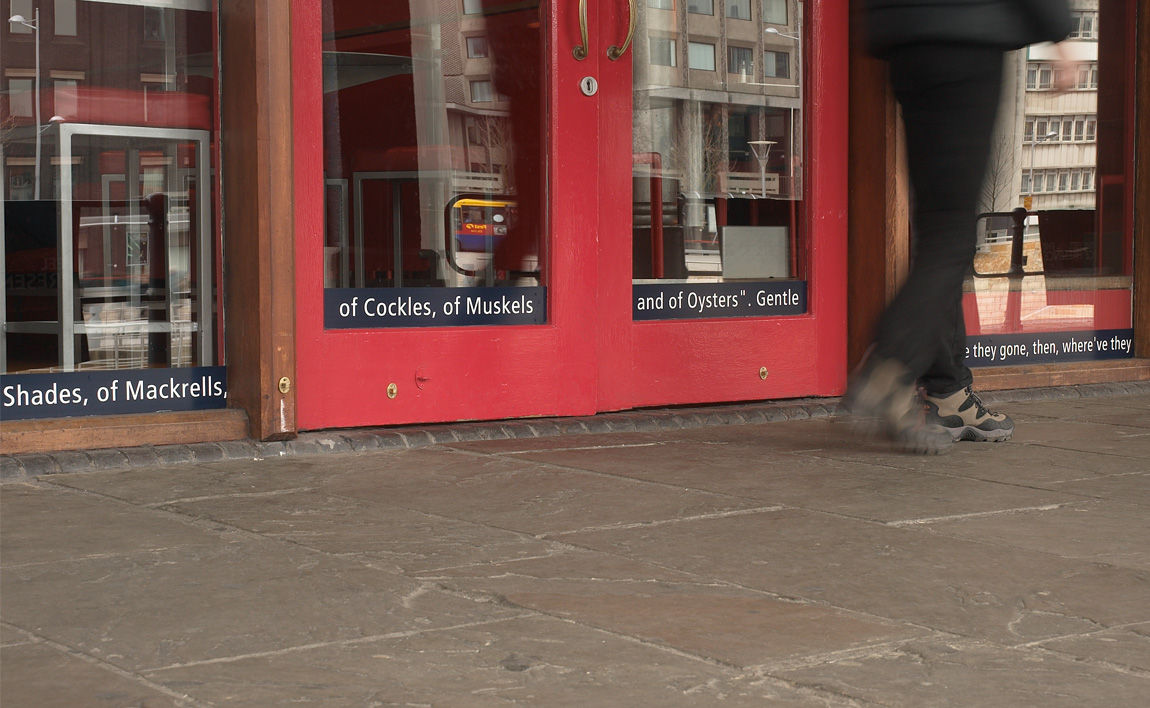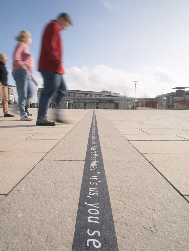 The project was created to temporarily introduce a poetic parallel information source into the city spaces, taking the form of long threads of text (pavement graphic) which were created especially for the project. Seen on various surfaces the text interventions contained a number of historical and contemporary themes as well as fragments of poetry and overheard conversation. Walkie Talkie began a physical and conceptual dialogue with the fabric of the city making audible the voices and stories that often go unheard.