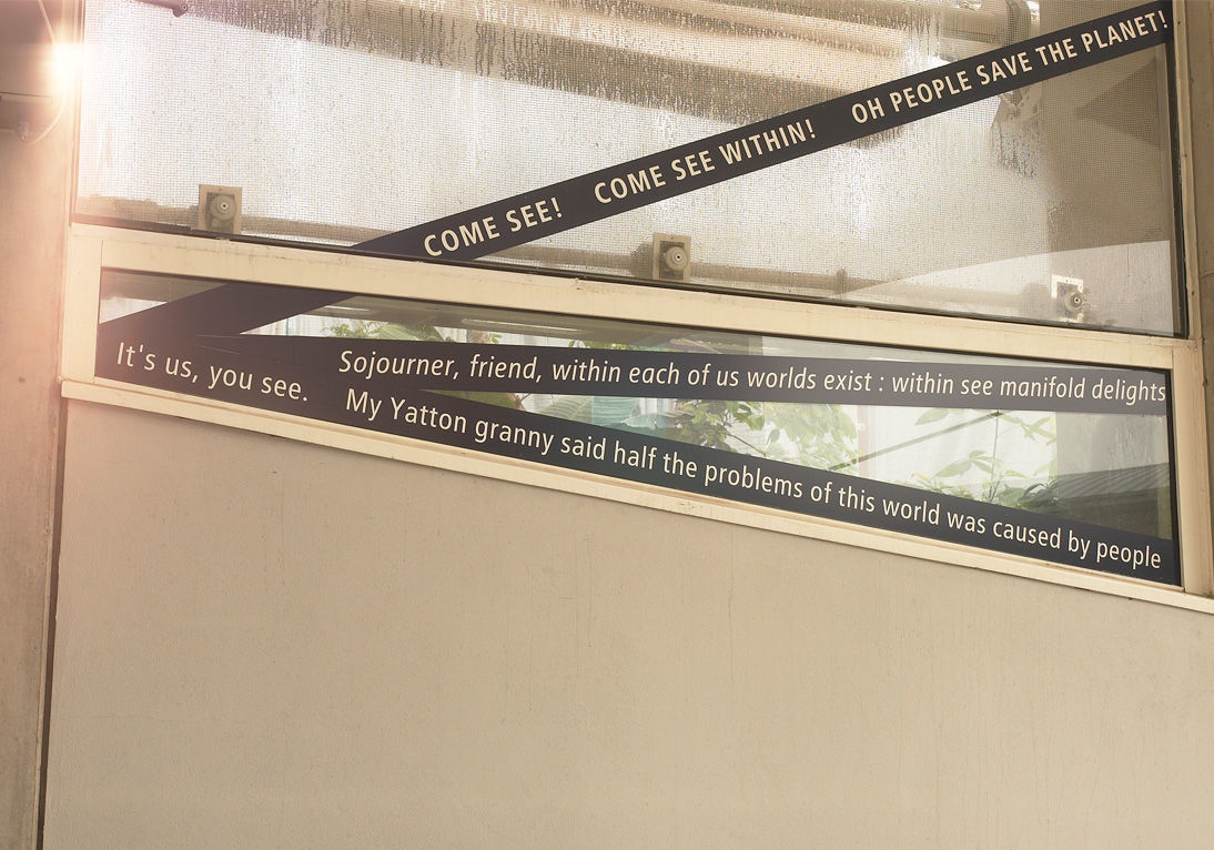 Walkie Talkie thread its way across Millennium Square, in Bristol's centre, and across spaces, floors and buildings around the At Bristol complex during February and March, 2001. It consisted of a thin line of language, approximately 3000 words, in a strip 10cm wide and over 640 metres long. The concept for the work is to imagine the finger posts of the sign system have fallen to the ground and been arranged into a single long line. Referring directly to the permanent signs via placement, colour linkage and font format, the text line appears to have been set free to career off and mingle with the fabric of the city.