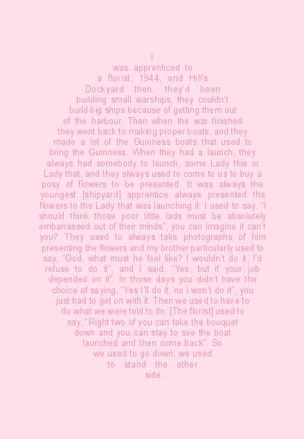 Paul Rooney, primarily known for his video and audio works, embraced the opportunity to develop his work as a text-based piece. By transcribing a personal story about a woman’s memories as a trainee florist onto paper, his work was distributed as a wrap around flowers sold via a florist on Prince Street Bridge. The intention was that the people who took the flowers home would think deeply about the meaning of the words they discovered.