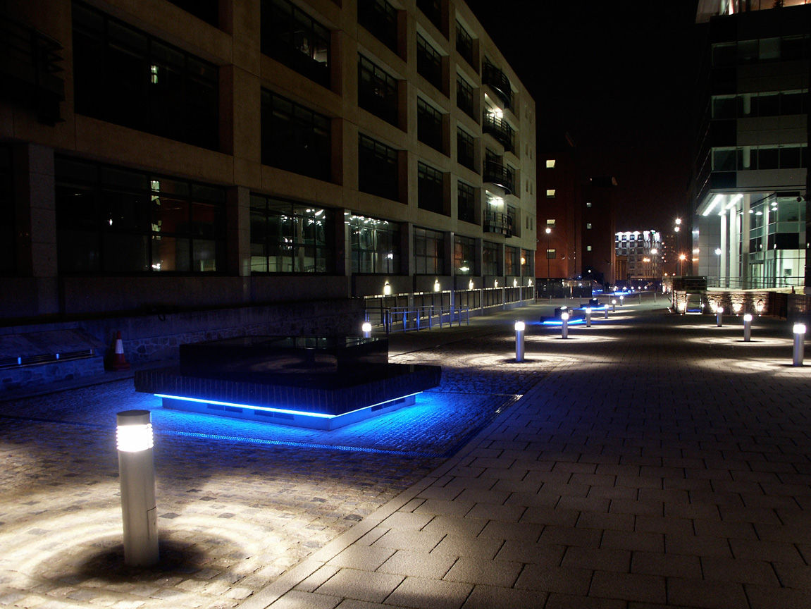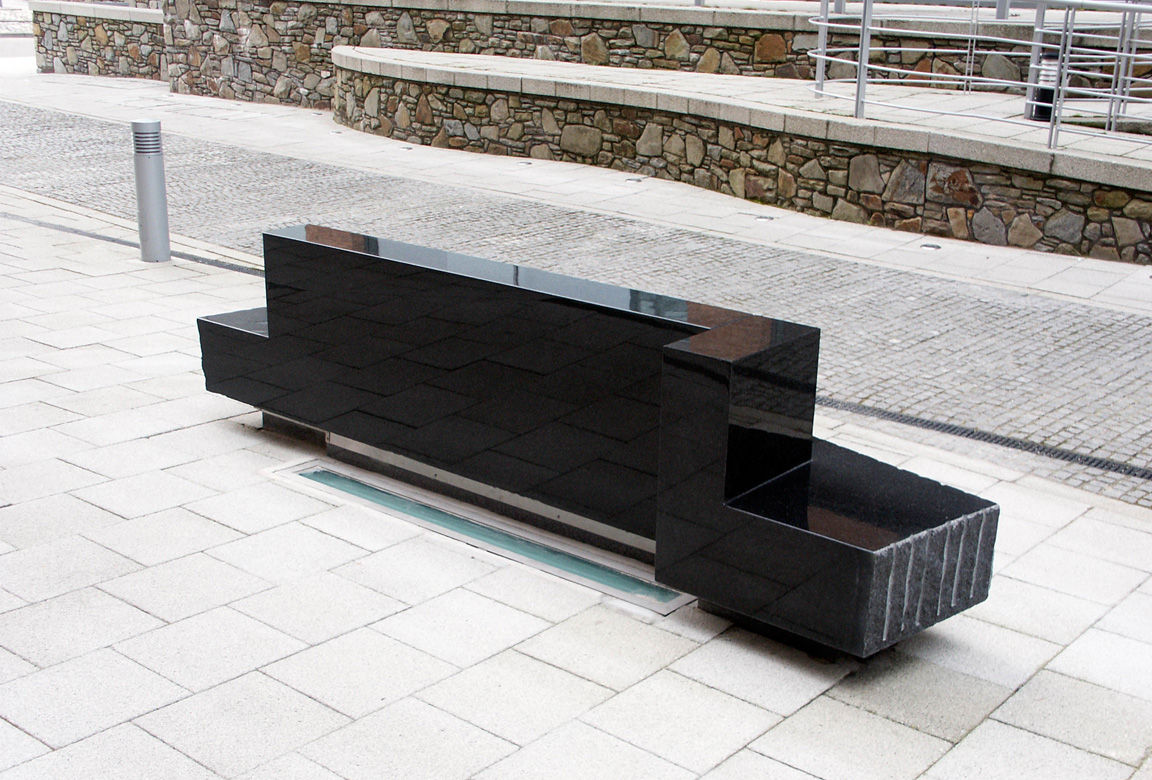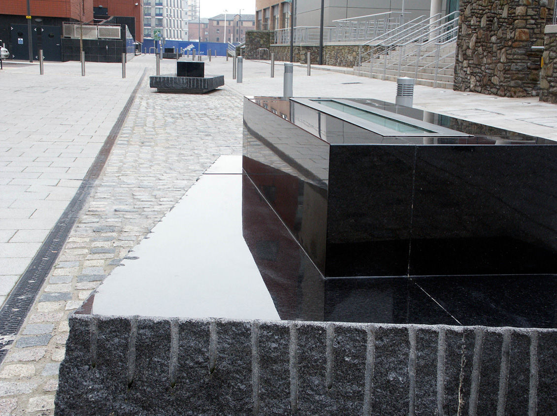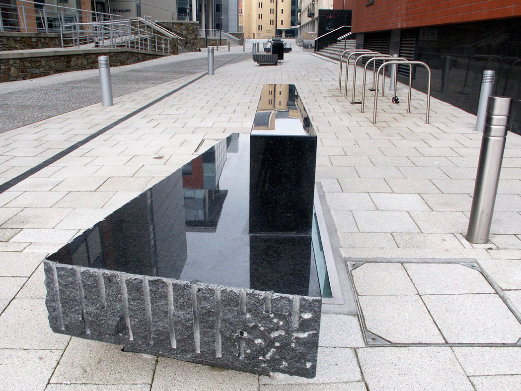 At key points along the route modular sculptures appear in polished black granite. Each subsequent sculpture accrues another piece until they become symmetrical benches underlit with blue neon. The last bench sits over a large, underground, illuminated and environmentally controlled room that houses and protects the Rivergate. The sculpture is enlarged and has a glazed viewing aperture through which the archaeology can be viewed. The complete artwork is over a hundred metres long and articulates the path between commercial buildings, whilst providing attractive informal seating for lunchtimes.