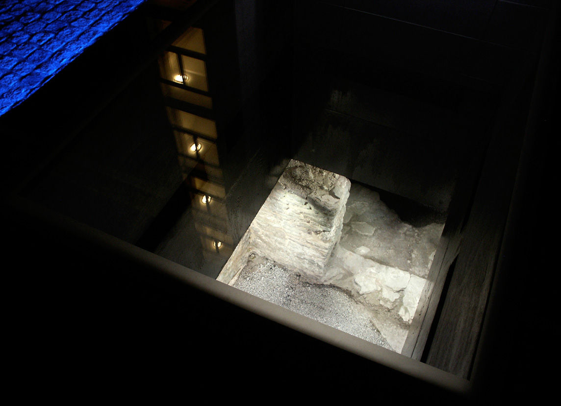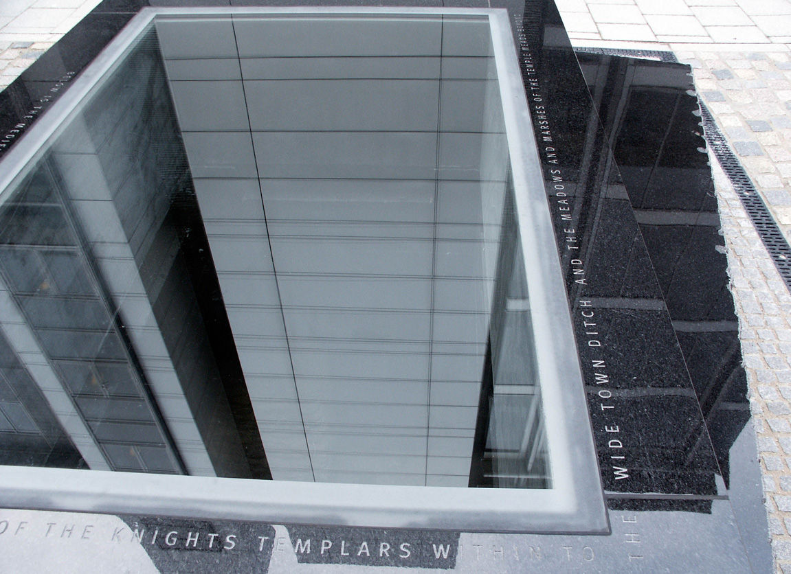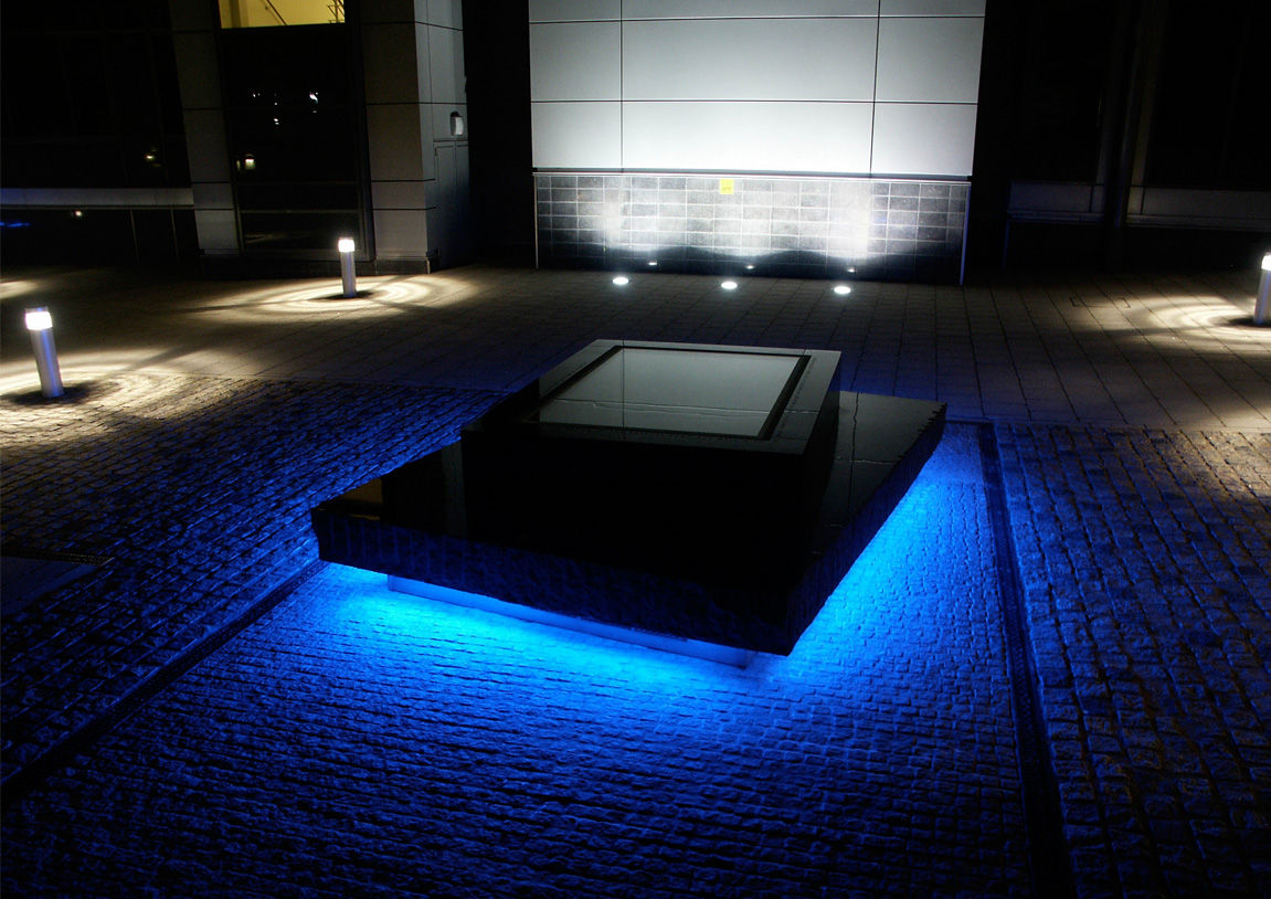At key points along the route modular sculptures appear in polished black granite. Each subsequent sculpture accrues another piece until they become symmetrical benches underlit with blue neon. The last bench sits over a large, underground, illuminated and environmentally controlled room that houses and protects the Rivergate. The sculpture is enlarged and has a glazed viewing aperture through which the archaeology can be viewed. The complete artwork is over a hundred metres long and articulates the path between commercial buildings, whilst providing attractive informal seating for lunchtimes.