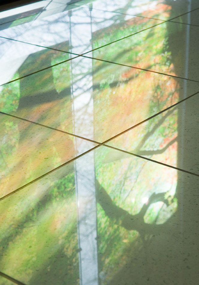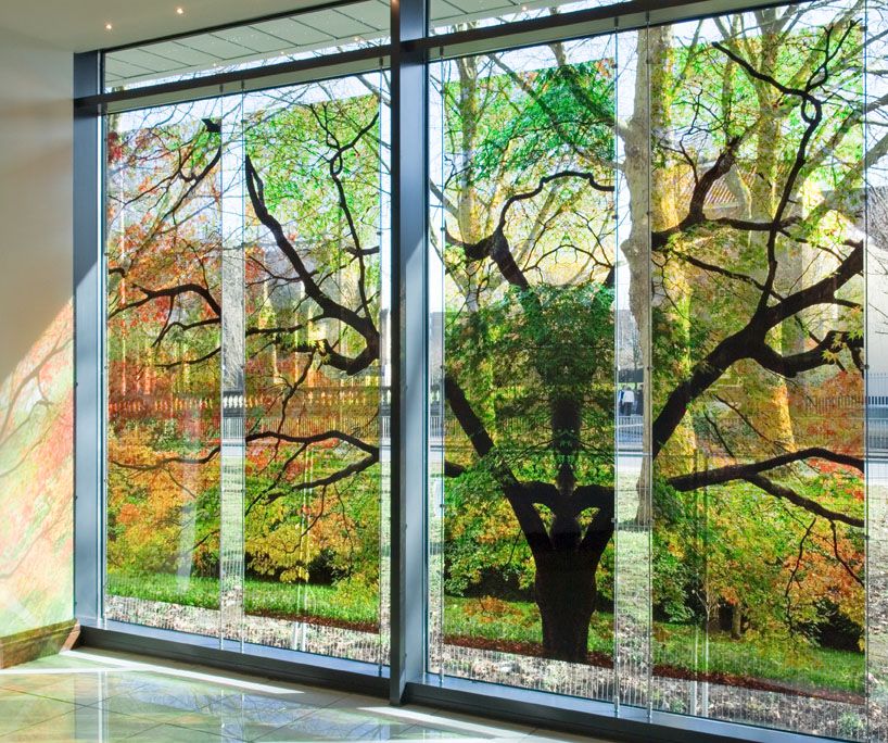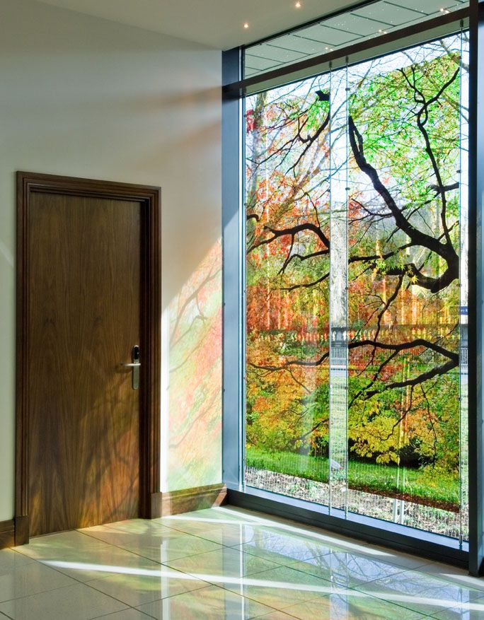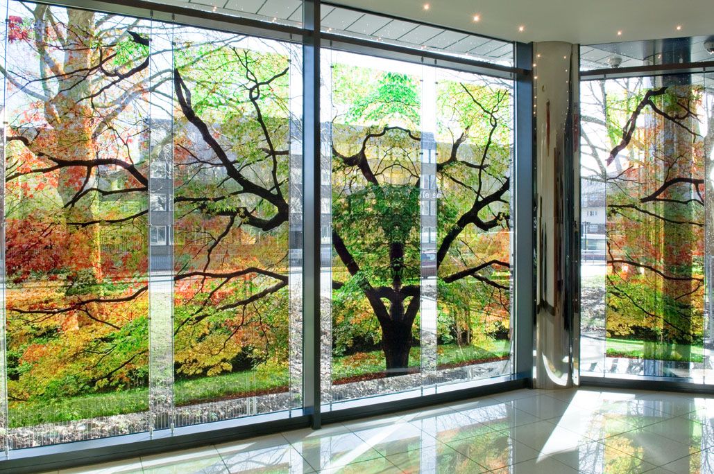 The idea was to link and bring aspects of the outside into theinterior and to create a seamless screen between the two. Photographic images were shot of tree canopies to work with the avenue of trees just outside the building. It was important that this would work across the wide expanse of glass just right of the entrance. We wanted to make a space that felt as if you were within nature. The imagery of the trees works with the existing reflections and changes in intensity throughout the day.