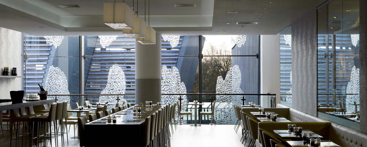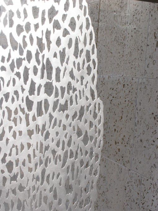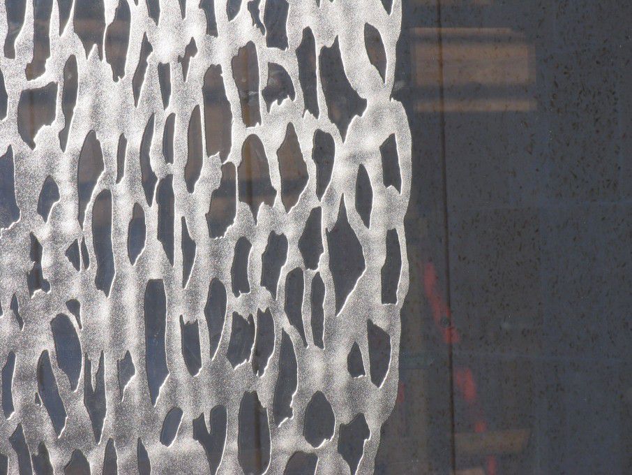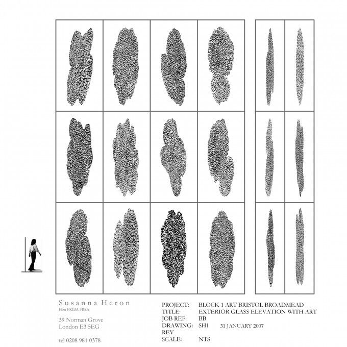 For the commission Heron developed a work within the building glazing, entitled ‘Roche (Glass) a sandblasted and etched three storey glass window, 14.4 m x 13.4 m located above the bronze frieze. The work is based on drawings made in response to the stone, surfaces, scale and geometry of the architecture to bring an awareness of changing light.