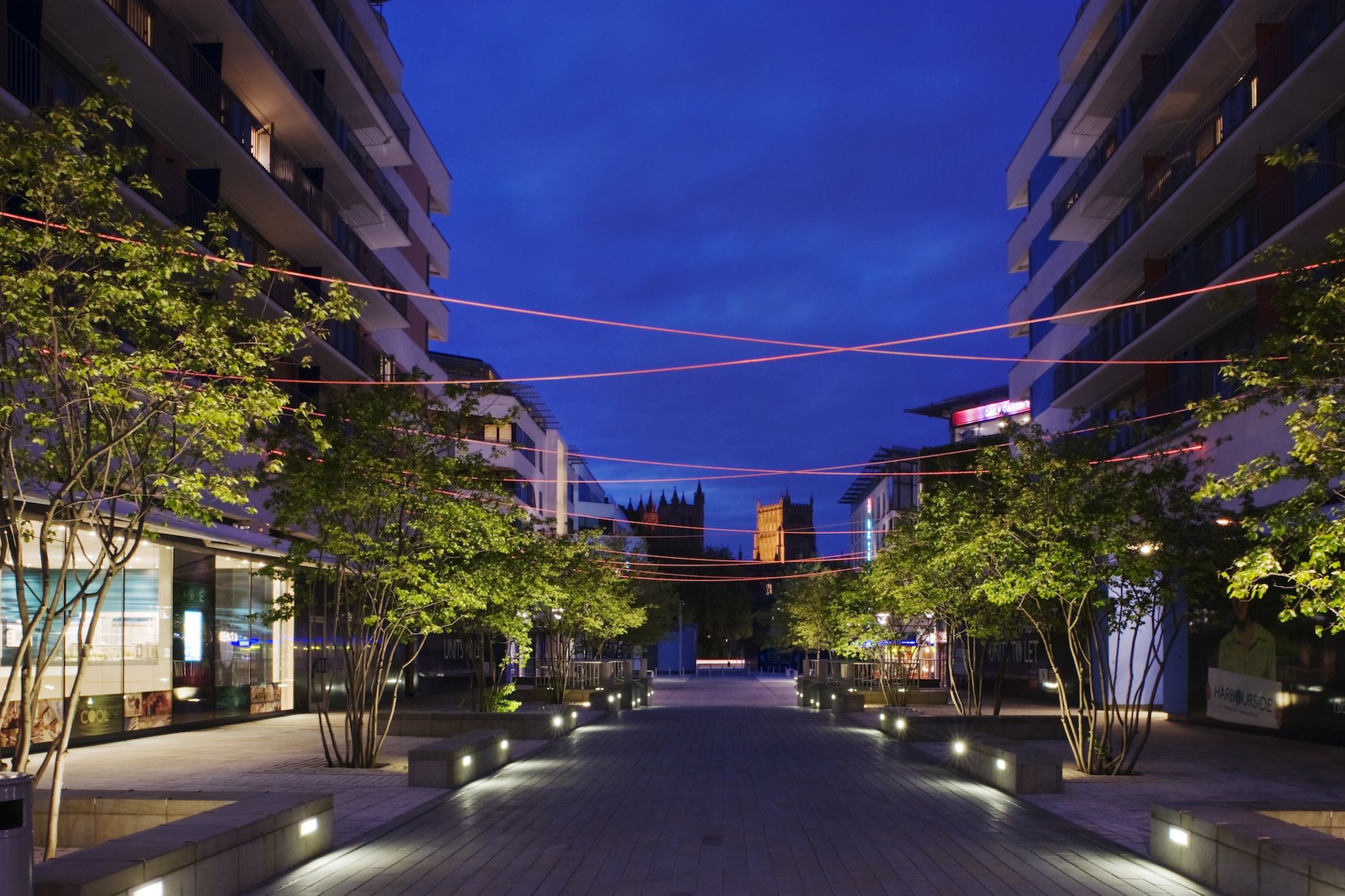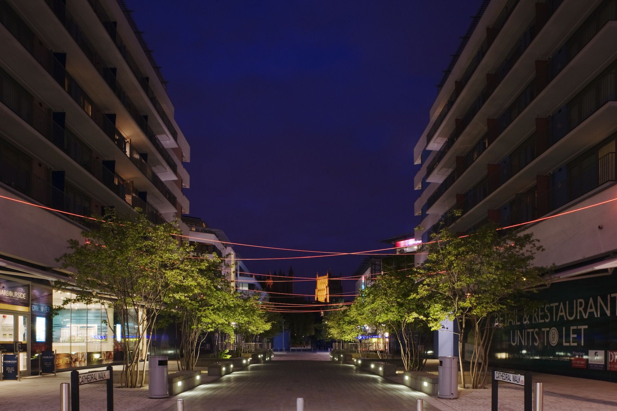 Parallax comprises 200 metres of fibre optic catenary lighting traversing Cathedral Walk. It links the two distinctive pink and blue semicircular 360 apartment buildings. The piece was inspired by a previous sculpture he produced called Chapter Eight. The two ropes of golden-yellow light interlace the two buildings. Soaring through the air, their bright swooping arcs create a carnival feeling, inviting people into the space they outline.