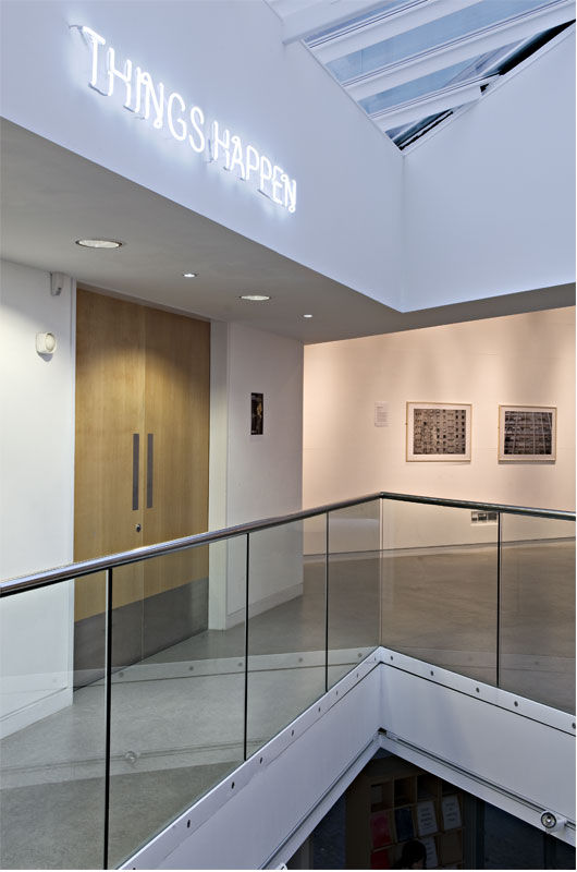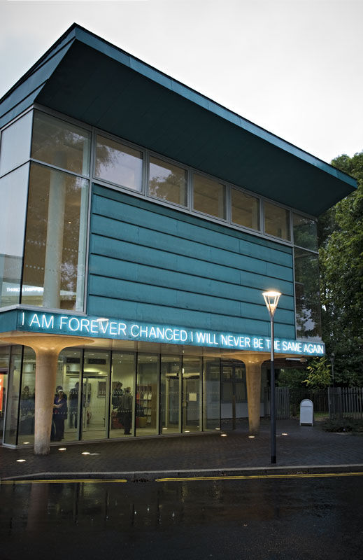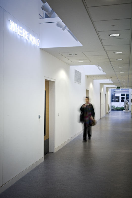 The artists developed a legibility framework called Neon comprising of interventions, both typographic and handwritten, which can be glimpsed between treetops, hidden in corridors and boldly sited upon architectural elevations. The work aids orientation around the campus as well providing an opportunity for a visual dialogue to emerge between the interior and exterior of the campus.