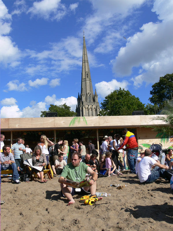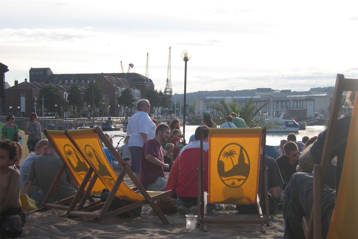 Bristol’s ‘beach within reach’ was a free event and ran from July to August 2007, everyday from 8am until sunset, providing a chilled, sandy space for families, office workers and visitors to enjoy summer in the city. Visitors to the beach were able to play volley-ball, build sandcastles, listen to live music, or join in the different events and classes that were staged over the summer- including knitting sessions and book markets to caporia and salsa classes.