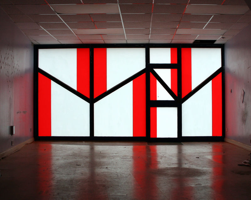 Originally built in the 1960s, these shop units are similar in style, with many having been identical. Over the years, the shop windows within the units had been ‘modernised’ by resident leaseholders to create a range of solutions to the problems of how to break up a given rectangular aperture. This aspect of the retail spaces was Leo Fitzmaurice’s starting point. His interest in the intersection between art, architecture, and design resulted in a series of ‘alternative’ window displays rooted in a variety of architectural and art movement styles from Neo-Tudor, Constructivist, and De Stijl. In taking these particular shop windows as an opportunity to think about a physical interface between architecture and graphic design, Leo Fitzmaurice sought to encourage in equal measures, thought about the physicality of a building and the layout of an image/text: the shop windows being the point at which the building structure dissolves into the design of a brand.