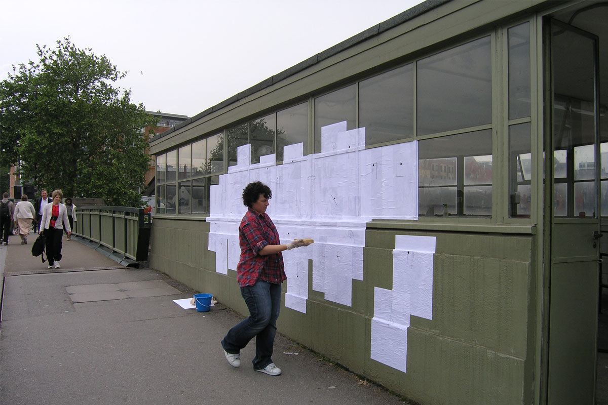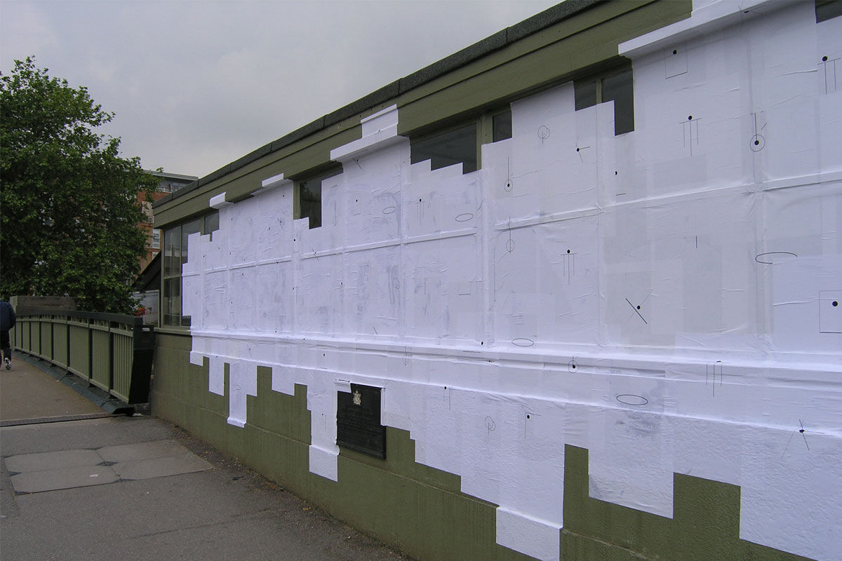 This commission utilised the exterior façade of the cabin with a series of A2 posters containing one of twelve symbols uniquely developed by the artist. Through research for the commission Sovay Berriman made associations between the architectural form of the cabin and the classic dystopian novel 1984 by English author George Orwell. The amalgamation of symbols building across the cabin reinforced an atmosphere of constant surveillance. During the course of four weeks the work was on display the posters were renewed and replaced creating a layering of undecipherable language