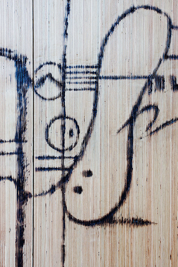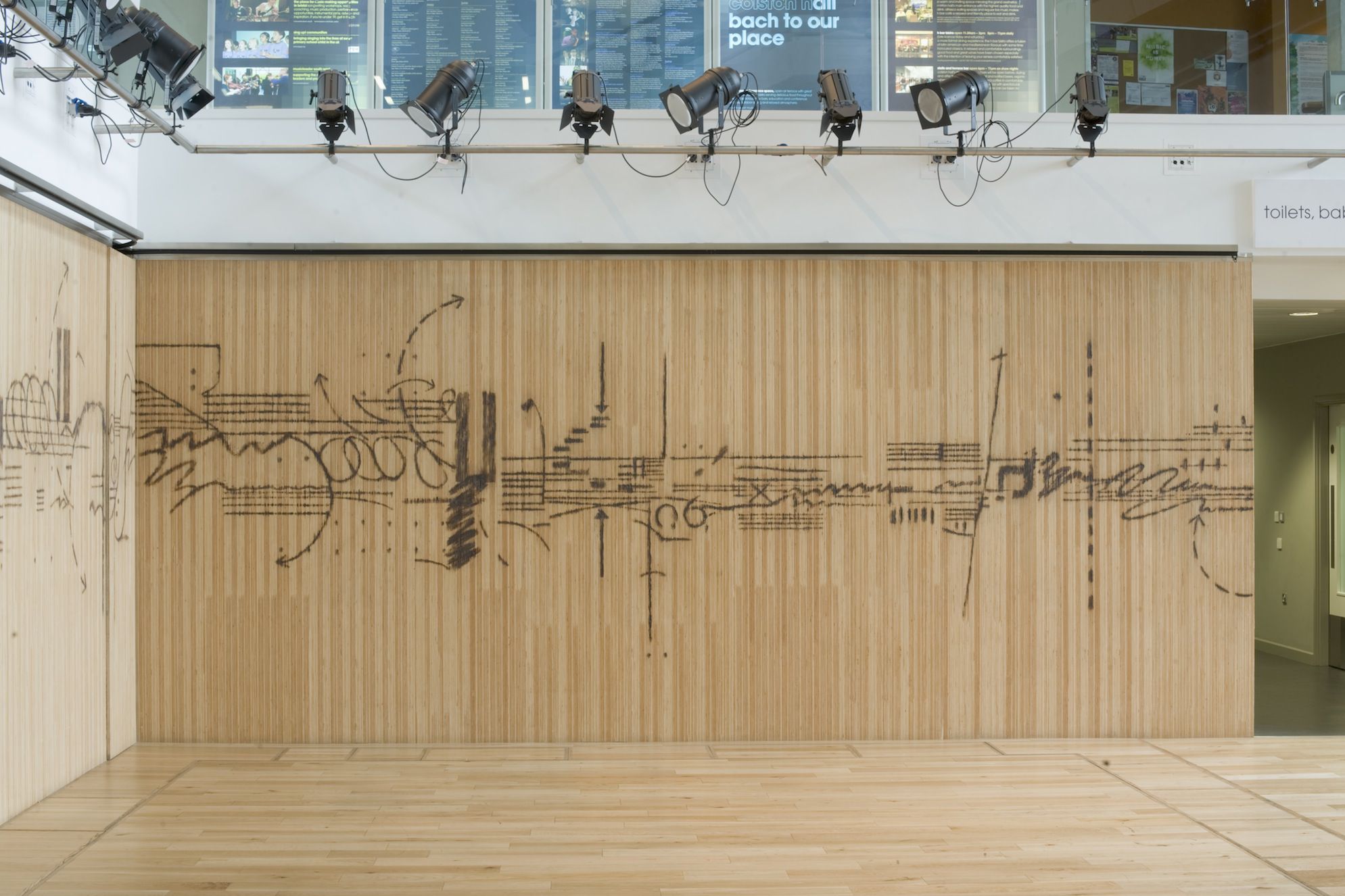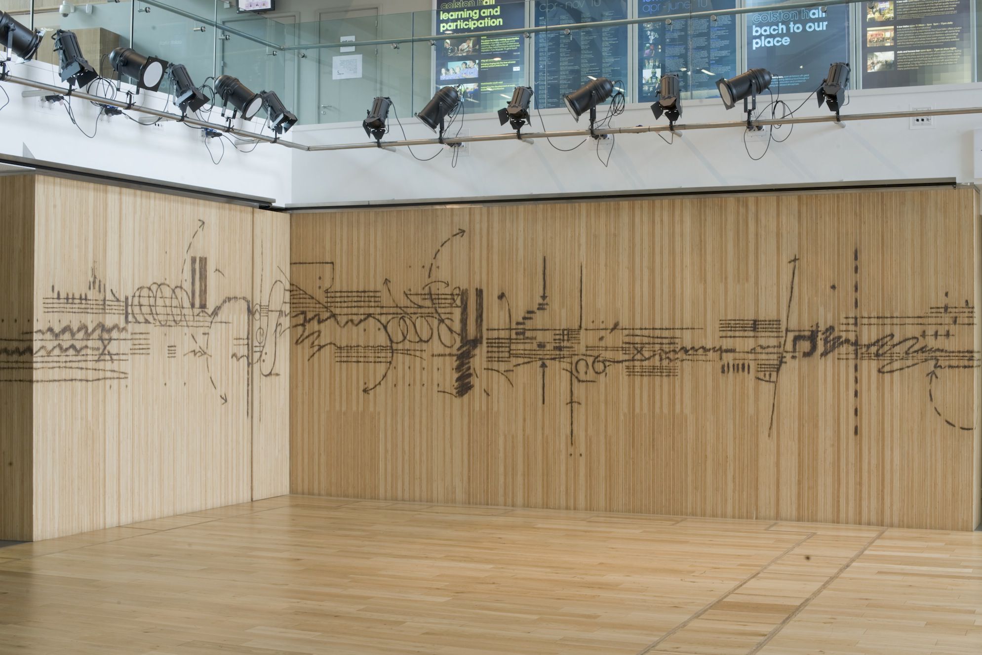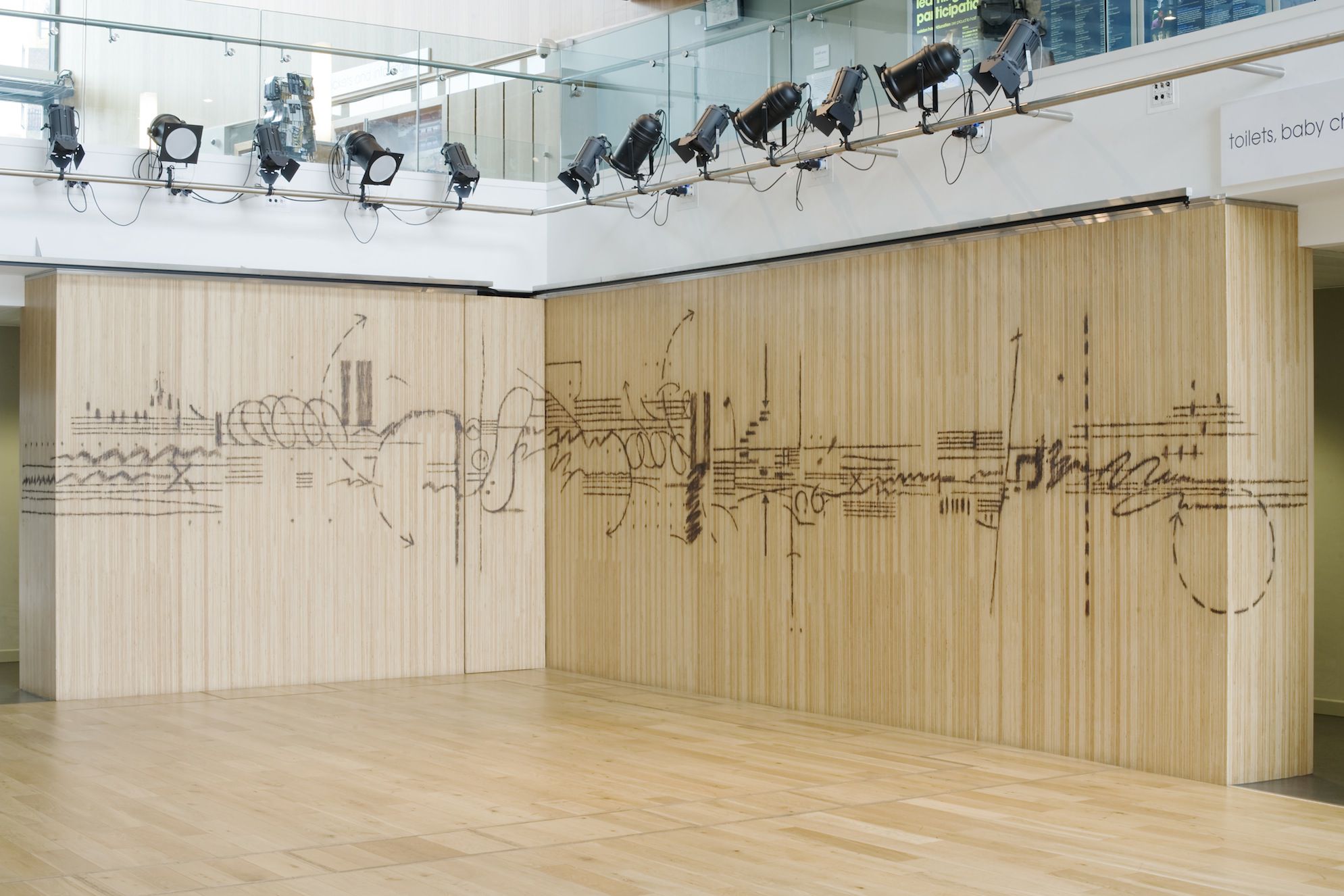 Wrapping around the ground floor performance space, Scorched is a twelve metre long Graphic Score that has been cut and burnt into a wooden wall. The effect of the process is to create a drawn mark that is akin to that created by a number of textile processes such as Shibori and Ikat; and reflects those marks used by Matthew Harris in his more familiar work with paper and cloth.