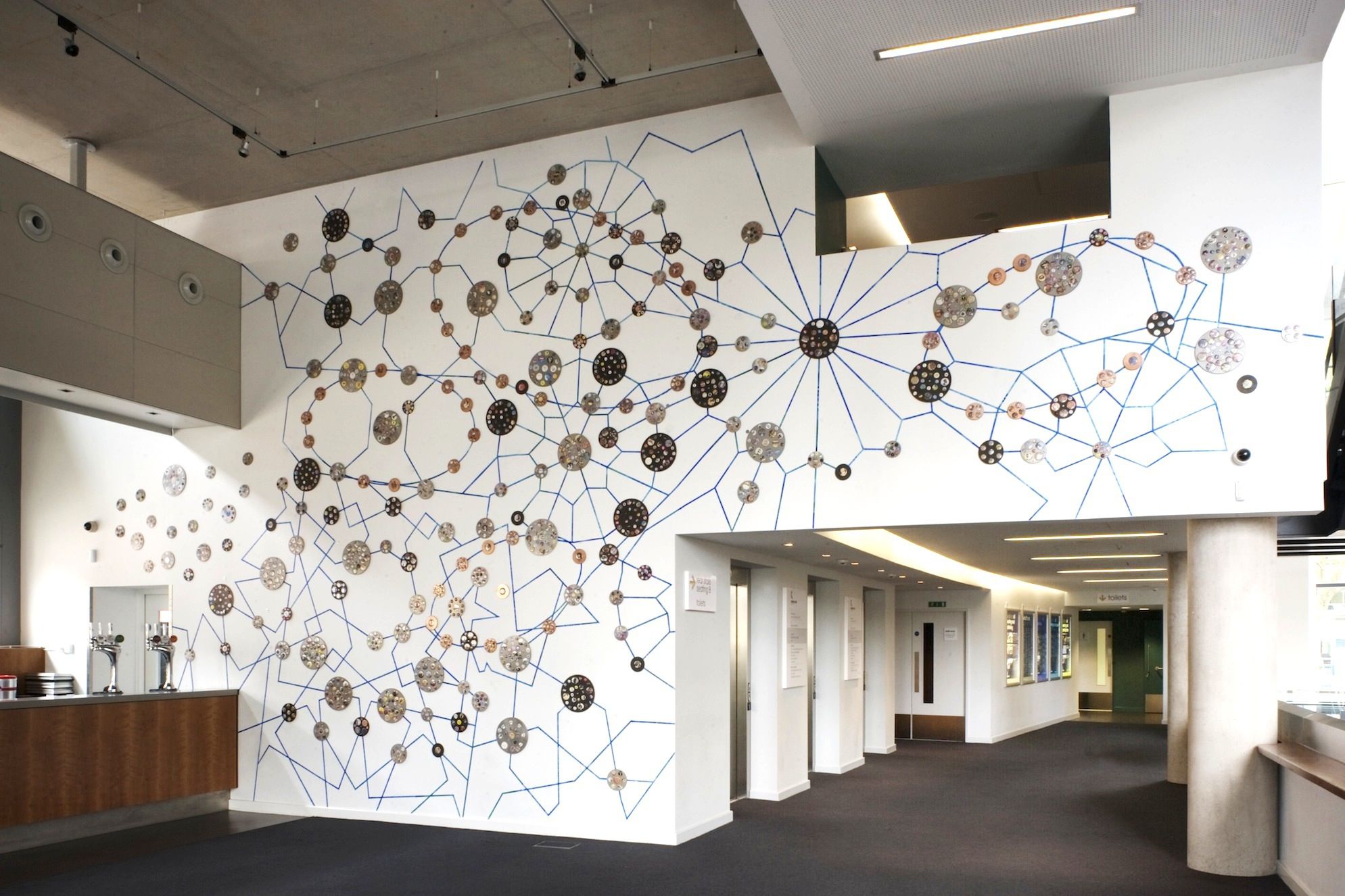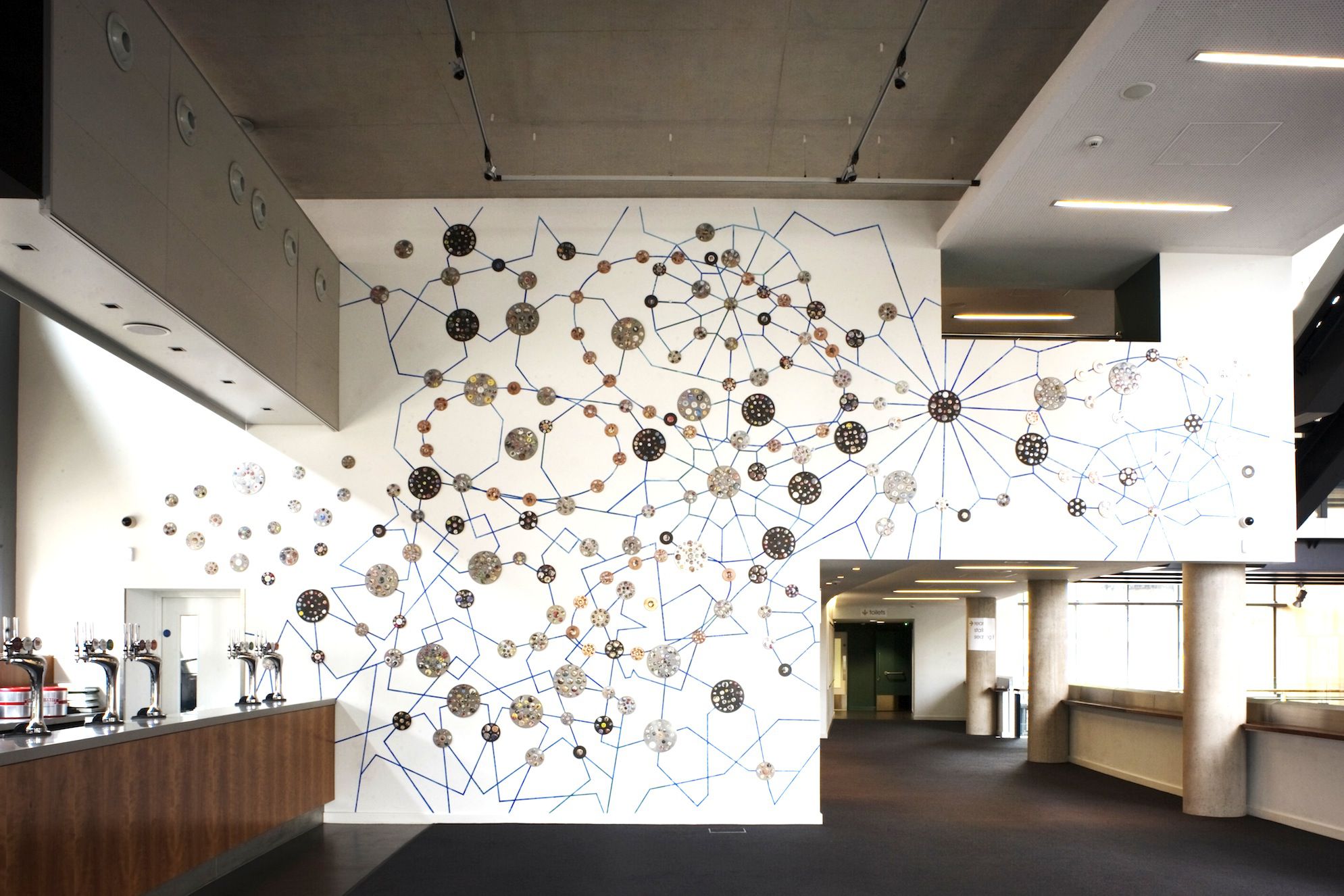 Brennand-Wood’s wall piece was made for the bar space and covers an enormous wall. Made up of a series of different-sized flat metal discs, the work appears to look like a giant star chart with each disc linked by bold geometric lines that from a distance create a giant, lace-like pattern. On closer inspection you can see that each disc symbolises either a CD, album or single, each decorated with a series of music badges, and together making up a diagram symbolising the relationships between different musical forms. ‘I envisage the work as a musical constellation of musical genres, carefully mapped to indicate musical connections and hybridization,’ explains Brennand-Wood.