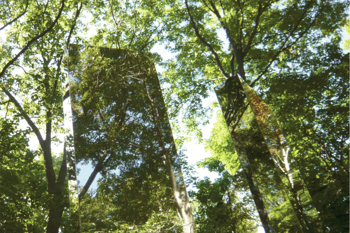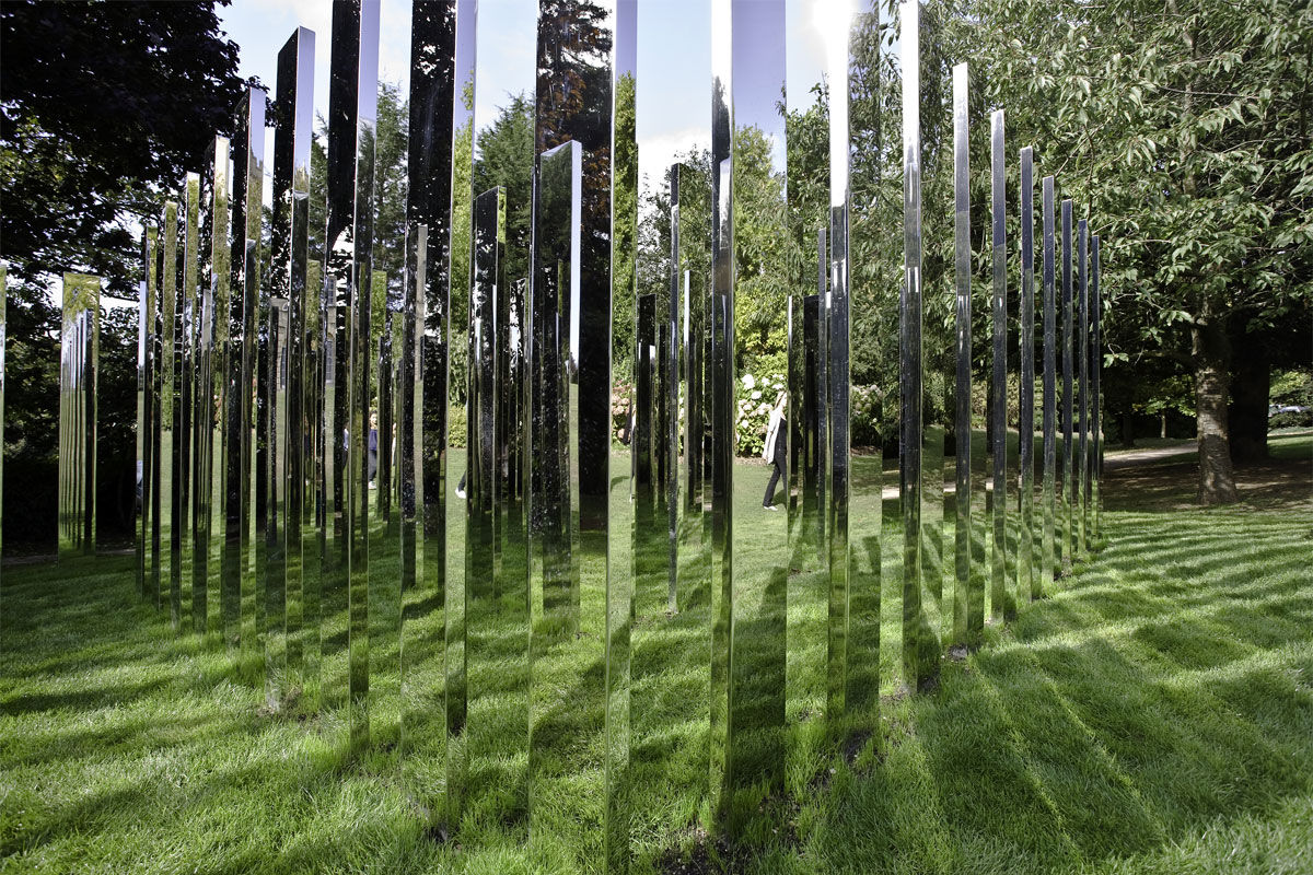 Follow Me comprises a square formation of 76 vertical polished steel plates sited at the base of an incline leading down from the historic Royal Fort House. Entering the labyrinth, the surrounding landscape and participants are multiplied through a dizzying set of reflections.