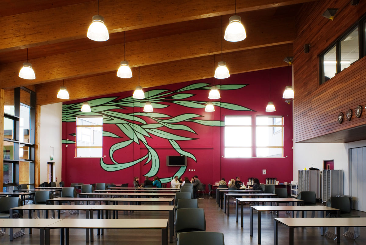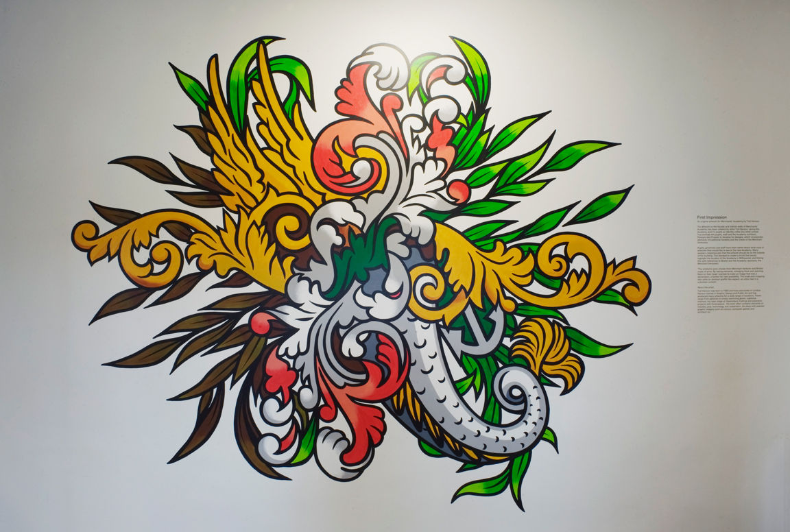 For the first commission, artist Tod Hanson painted directly onto the facade and interior walls of the Academy. Hanson worked with pupils, staff and the Academy architect, Penoyre and Prasad, to develop his vibrant and distinctive designs, which incorporate elements of traditional heraldry and the crests of Bristol coats of arms and the Merchant Venturers, the Academy sponsors.