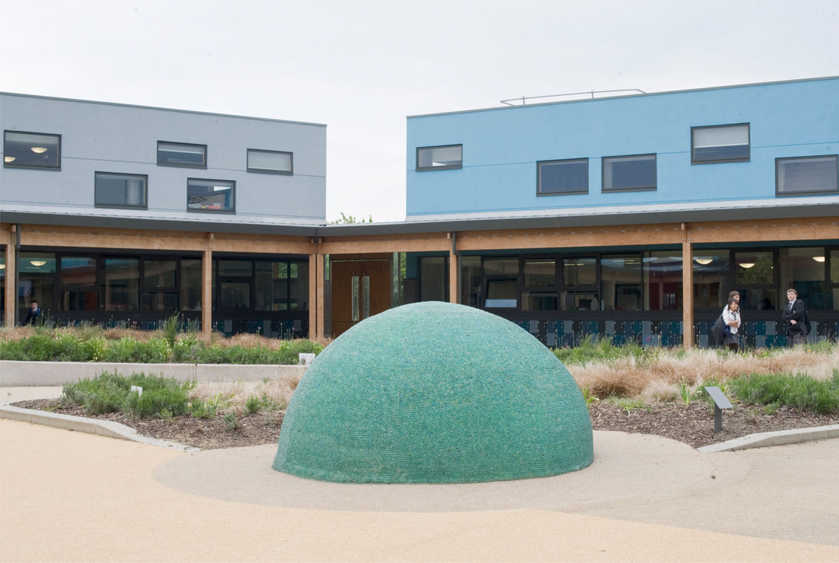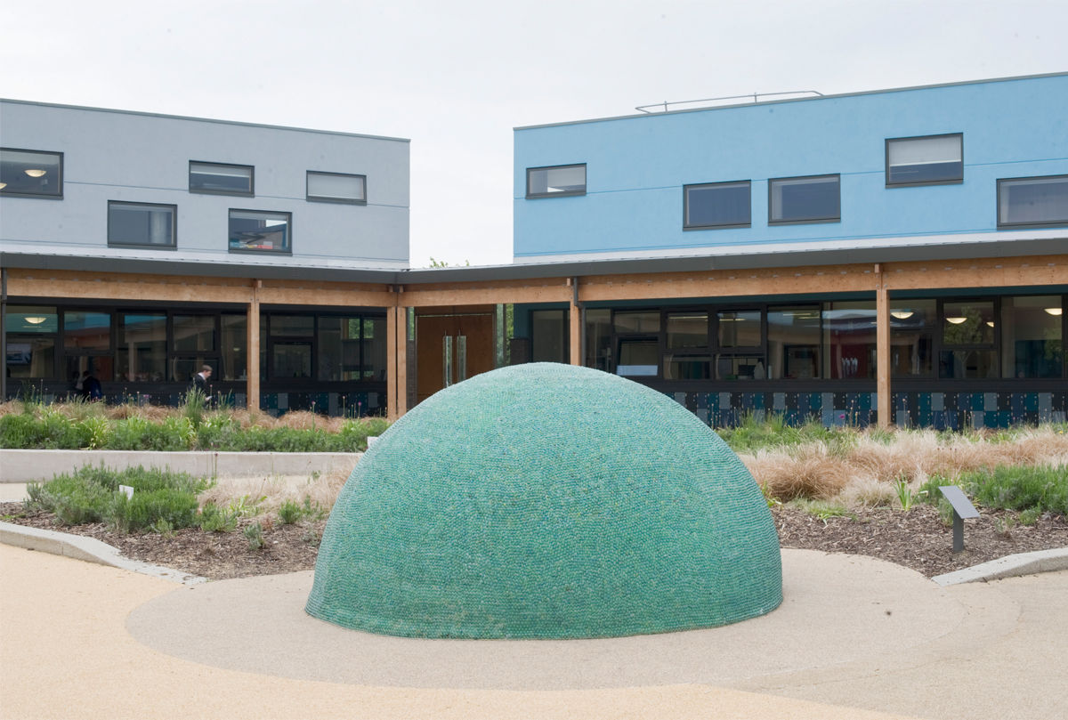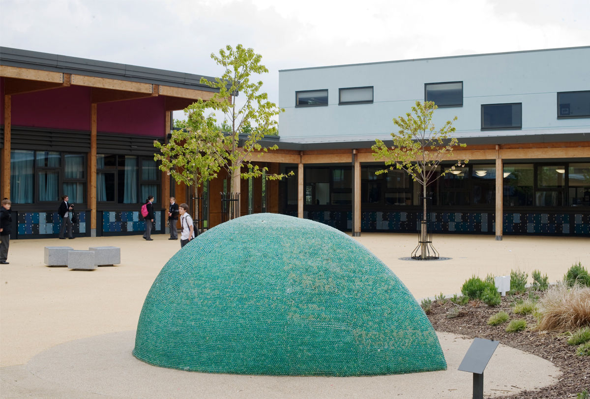 The second commission was by Glasgow based artist Stephen Skrynka. His work Resurgam, located in the central courtyard, incorporates a marble clad pod dotted with tiny portholes, through which to view a time lapse film of the previous school being graffitied and subsequently demolished.