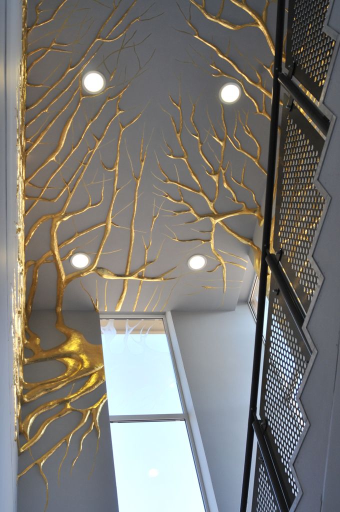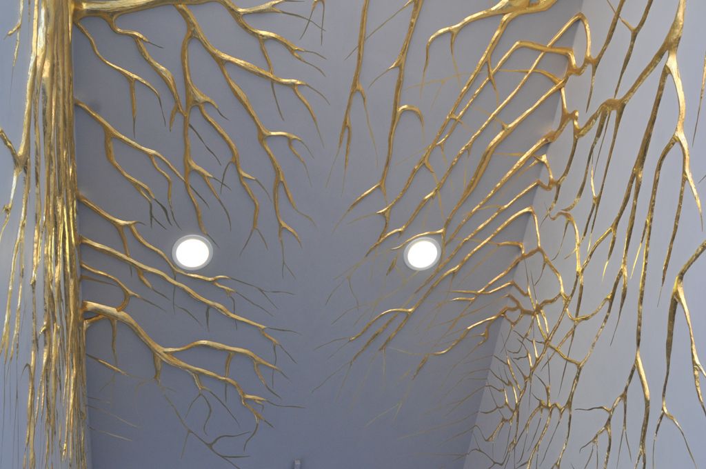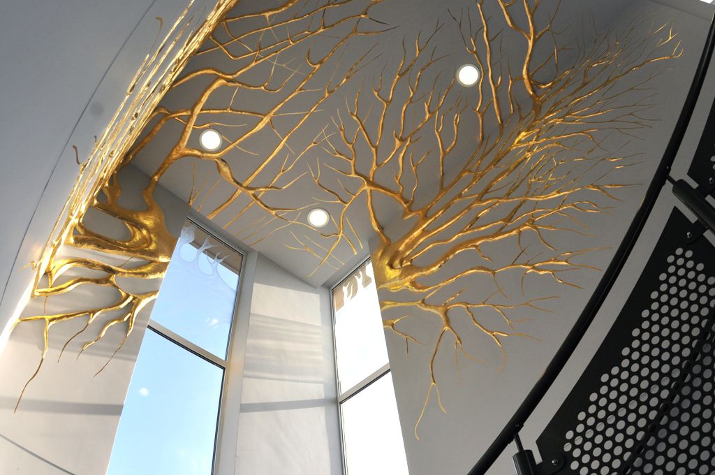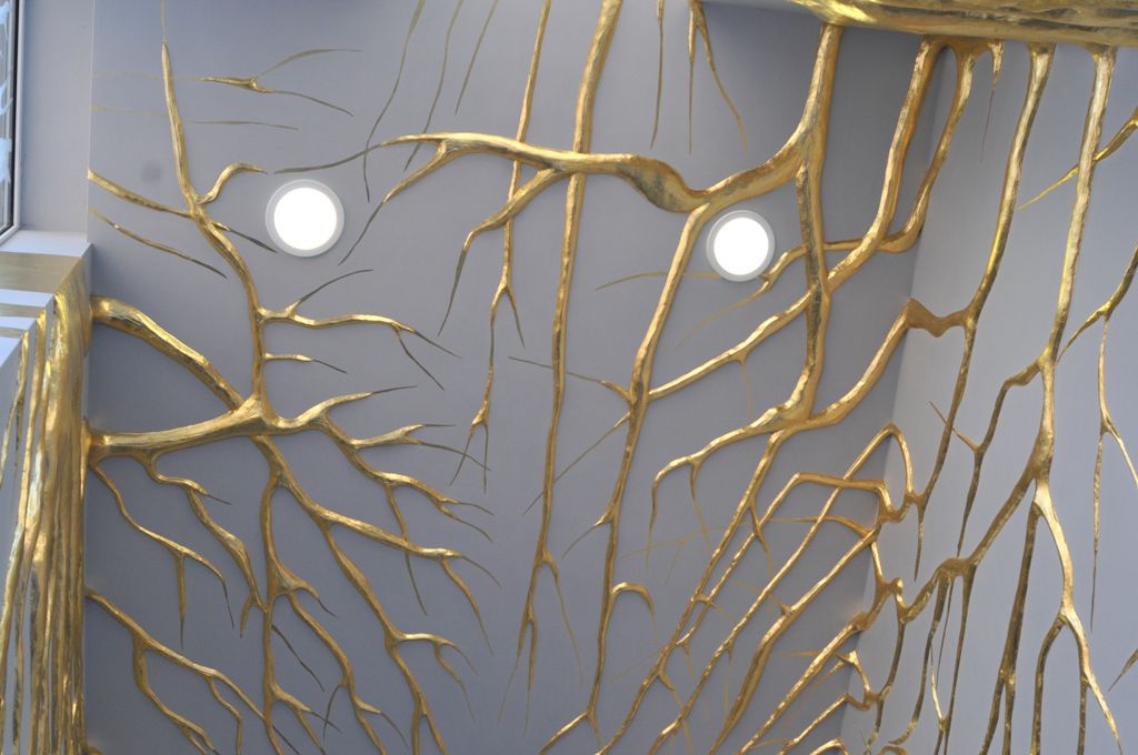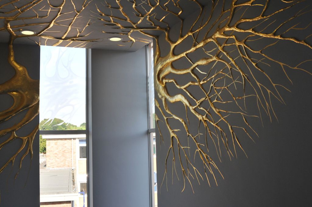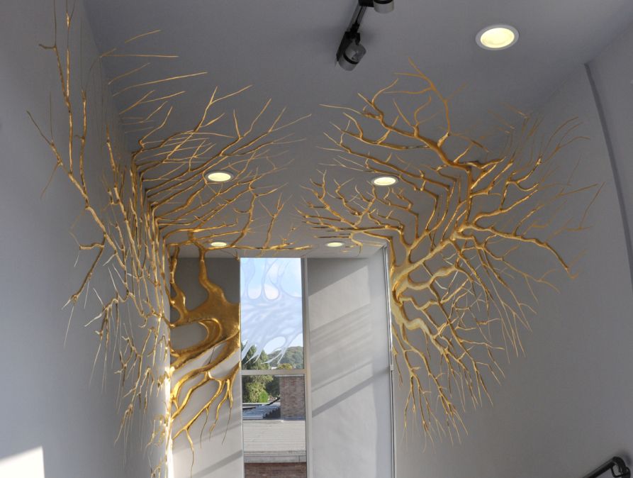 Transpire is a new art work by artist Elpida Hadzi-Vasileva for St Bedes and was installed in August 2010. Developed over the course of a year, and with an intensive 3 month period on site, the work comprises a magnificent 24ct gold-leaf tree form. Highly sensitive to changes in the ambient light the artwork was designed for a key stairwell where its entwined roots and branches extend over the ceiling, walls and windows, transforming a school stairwell into a magical internal space.