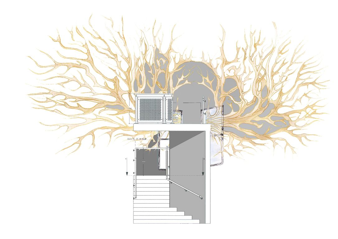 Transpire is a response to the history, traditions and culture of the school, developed with the input of students, and staff, and working closely with the development architect. The adaptation of traditional techniques for contemporary settings, in this case Baroque stucco work and gilding, is not only typical of Hadzi-Vasileva's work, but here reflects the sentiments of self-confidence, vitality, freedom and spiritual ecstasy common to that era. Transpire attempts to explore the tensions between and within spaces, evoking a sense of mystery and complexity between that which lies beneath and that which manifests itself above.