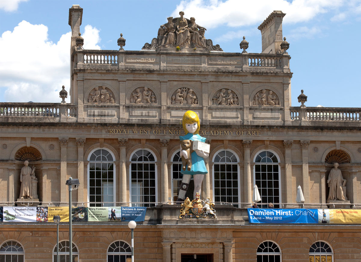 From June 2011 to May 2012 The Royal West of England Academy hosted Damien Hirst's work 'Charity' a monumental sculpture based on 1970's Spastic Society collection box. Standing at over twenty two foot the work was on view to the public, located on the RWA's grand balcony.
