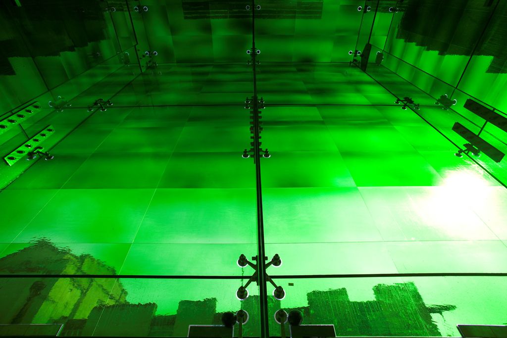 The green glass used is a single hue washed across the glass facade. It deepens from transparency at street level and graduates through to a fully saturated colour at the top. This allows people using the building to have clear visibility through the glass as they enter or leave the building but still gives sufficient definition of colour to create a focal point.