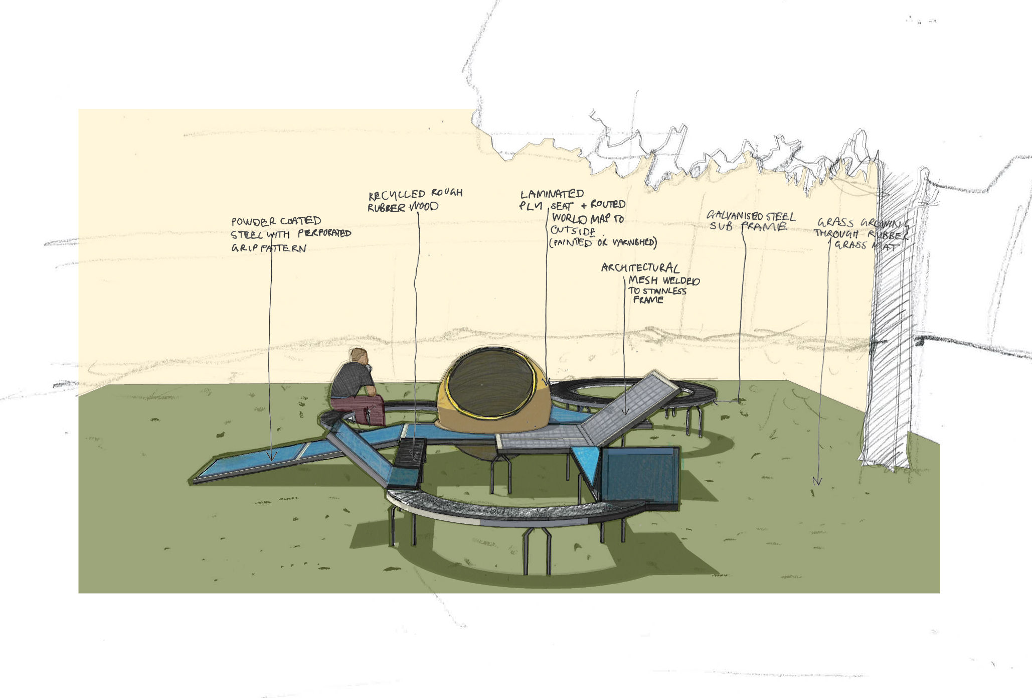 Based on the initial workshop the artists took forward an idea for an art work based on a key principle; a special space for students and a place for school kids to sit outside of their building, to chat amongst themselves or with staff; an oasis from the school environment and everyday tensions. Through several design revisions to make a design that would permit users to be both inside and outside, a final design was agreed with multiple entry points, defining a boundary but not creating a barrier or barricade.