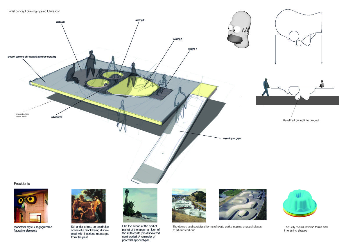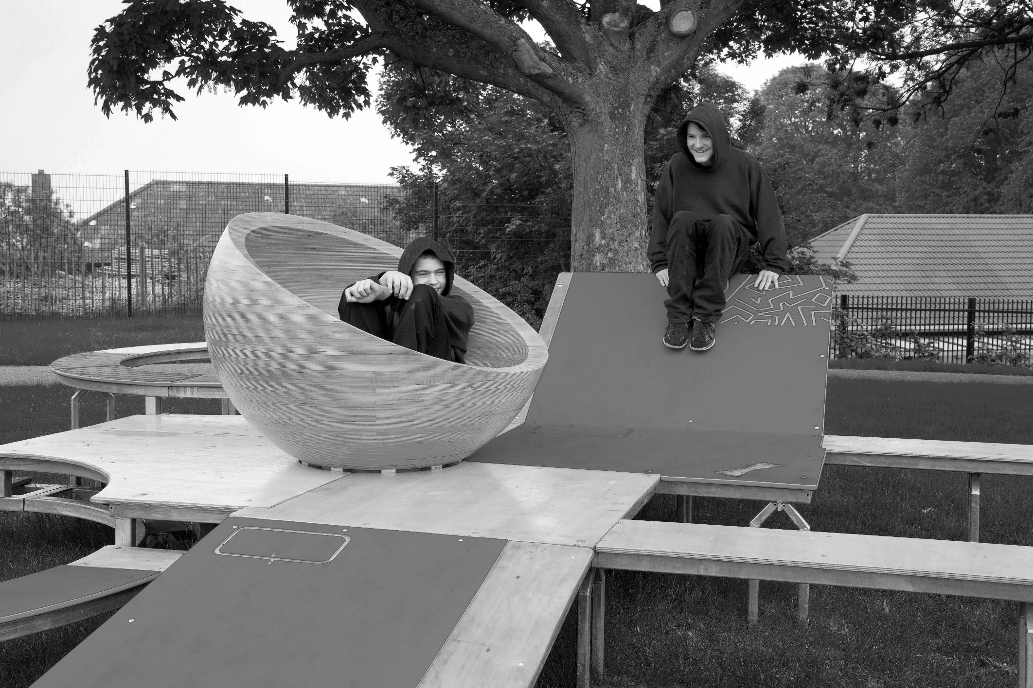 The end result is a playful structure situated under a mature tree in the school grounds. ‘The Out/In Space’ is an abstract form loosely (and incidentally) based around a face, drawn from different cultural references, ranging from Mickey Mouse (ears), to Homer Simpson (eyes) and taking in motifs from a Corbusier building along the way. The work is an eclectic mix; a skeletal structure or 'ship' made up of cultural references which has been left like a relic in the controlled landscape of the school, where it will used by a new generation to think through and discuss their issues, problems and bright futures.
