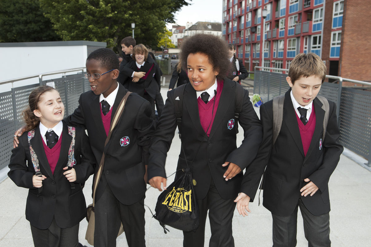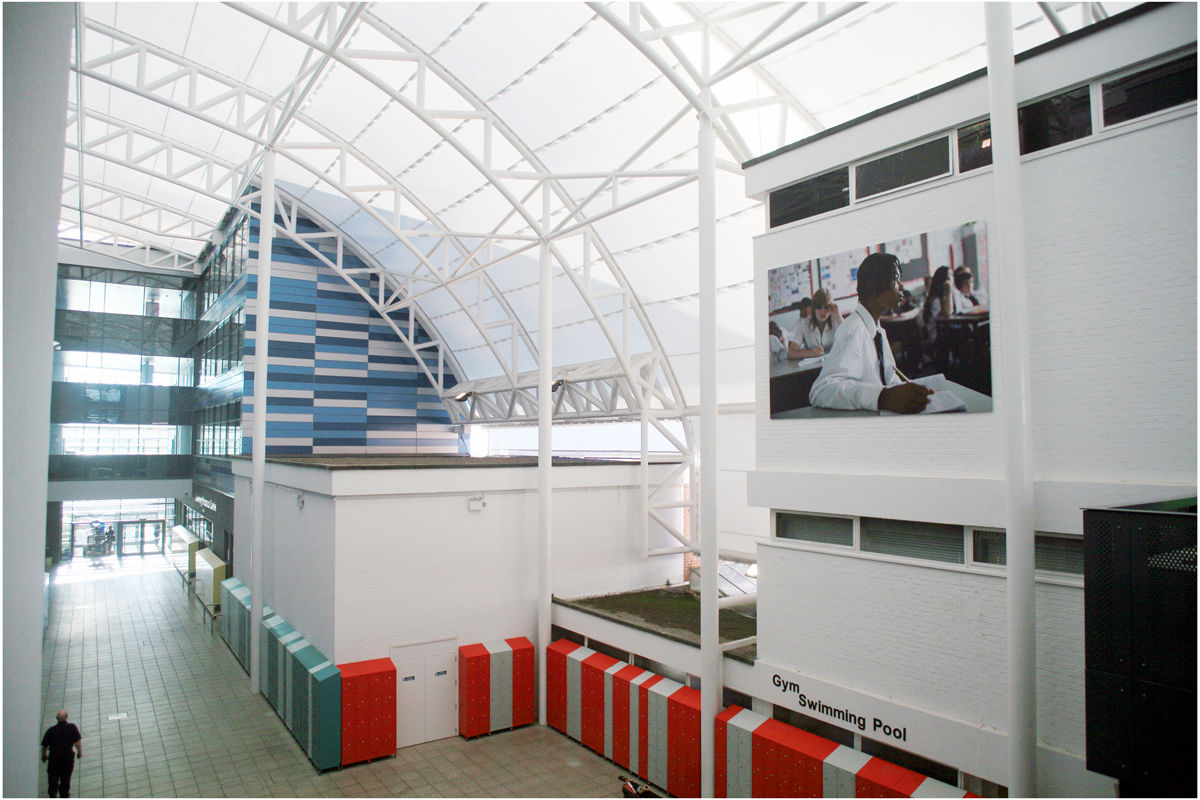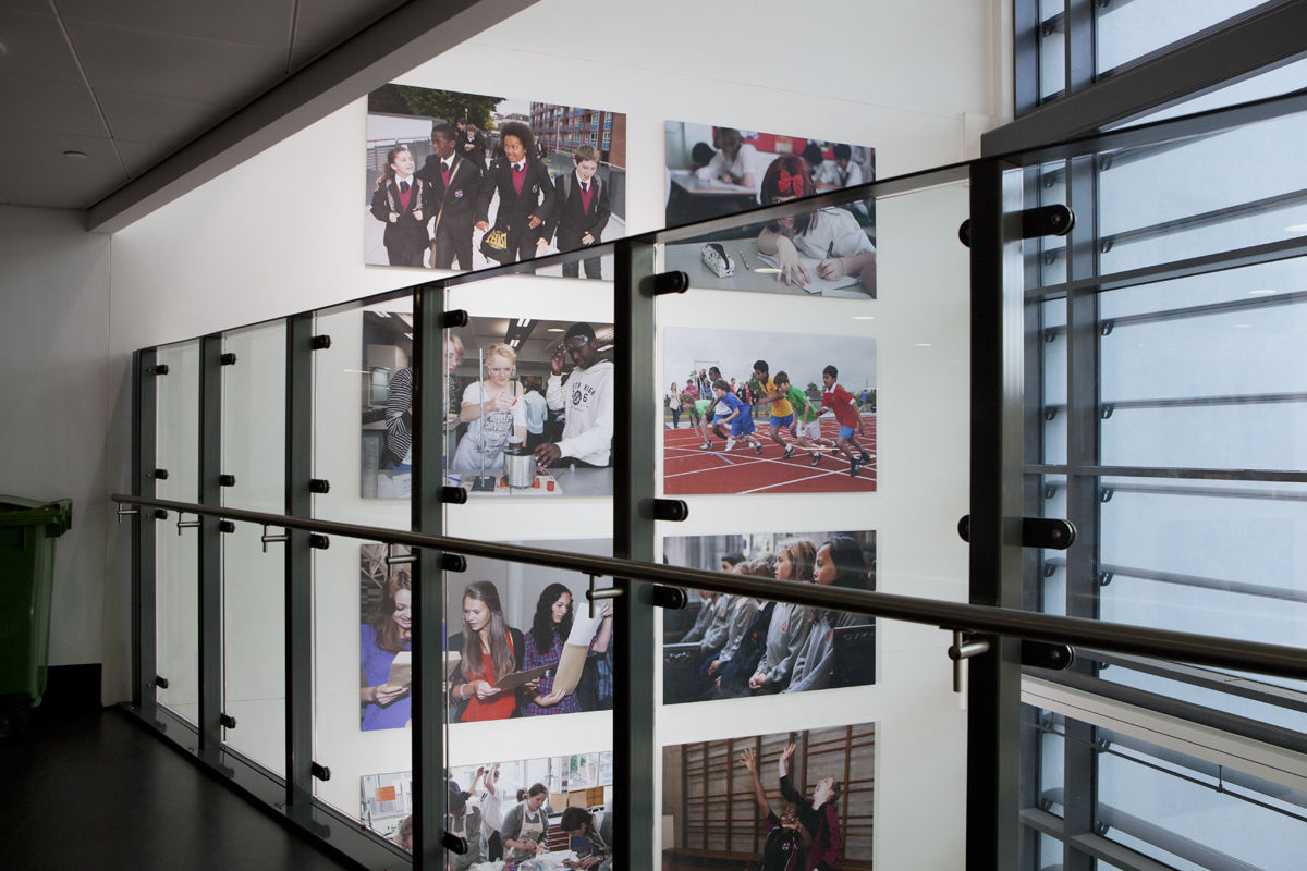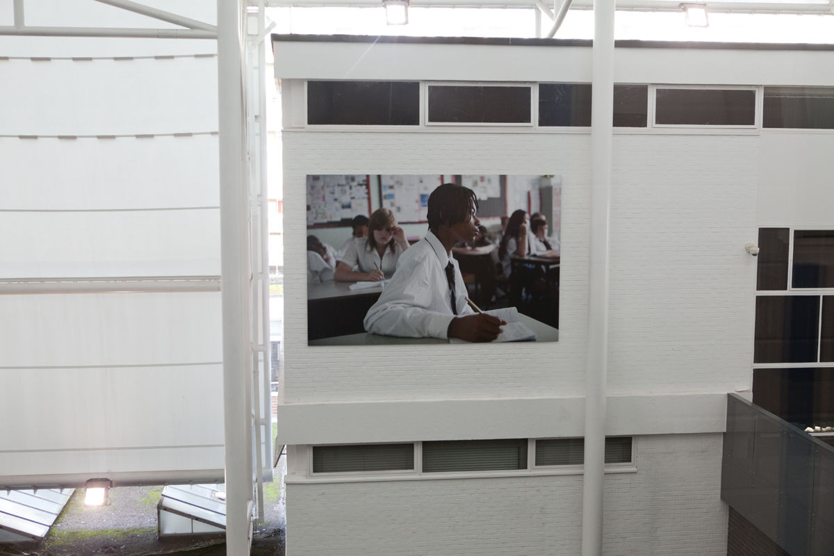 The commission for the school features a number of permanent and temporary works. This includes a large frieze of images in the schools 4 storey atrium, selected from the artists archive developed over the last 12-18 months, together with a giant photo work for the schools exterior ‘avenue’ space, (a partially covered space located between the new and old school buildings). A digital screen near the schools entrance also show the full suite of images shot during the artists’ commission period, together with a newspaper; published for every child and launched in tandem with Arnolfini's interaction team in December 2011.