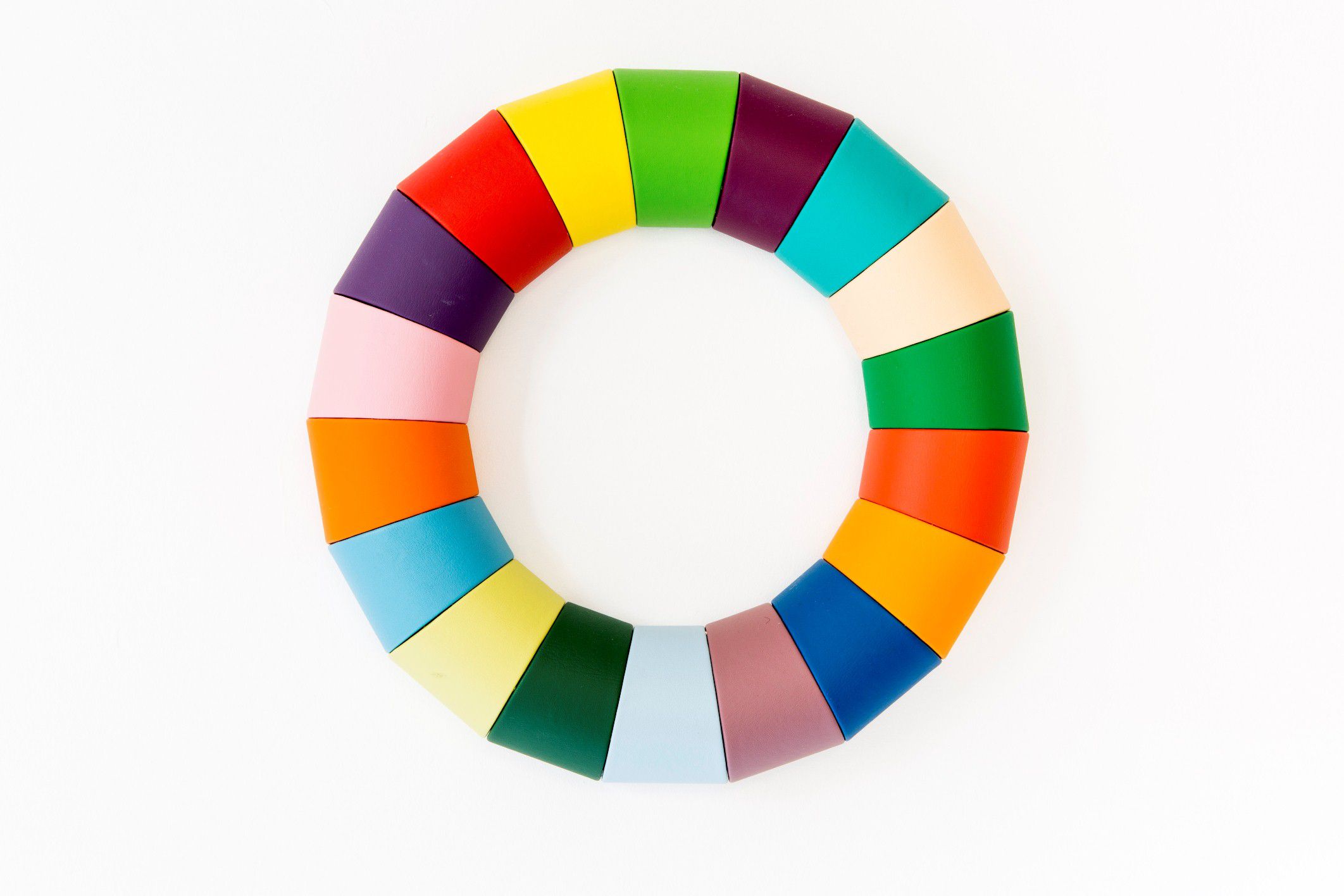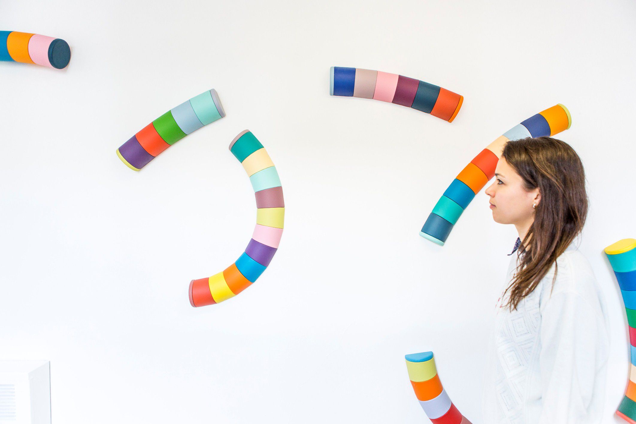 Seamus Staunton is interested in the potency of sound and the way that music maps emotion and mood. Previous sculptures have often employed forms deriving from sound wave patterns and frequency graphs. Some have been likened to the sound boxes of musical instruments. Staunton's recent wall-mounted Constellation series have a highly reflective coloured external shell enclosing a flock -lined interior chamber in contrasting colour. A number of circular apertures punctuate the surface drawing the viewer’s gaze to an inner space that remains elusive, their soft matt interiors suggesting muffled intimacy. The regular rhythm set up by the pattern of holes suggests a cellular form with the potential to grow in any direction.