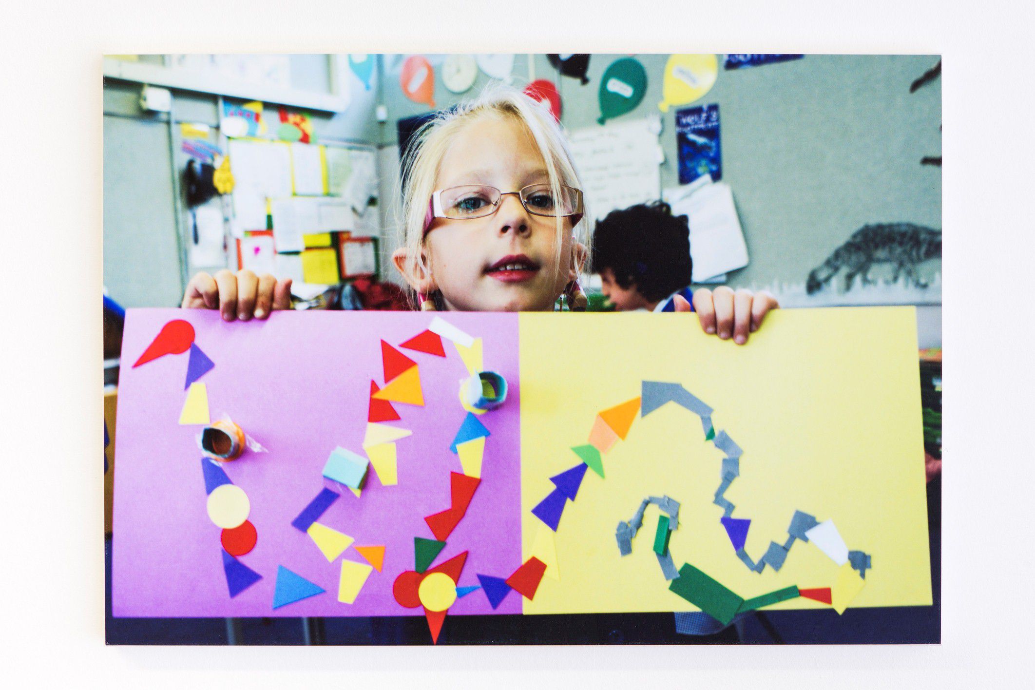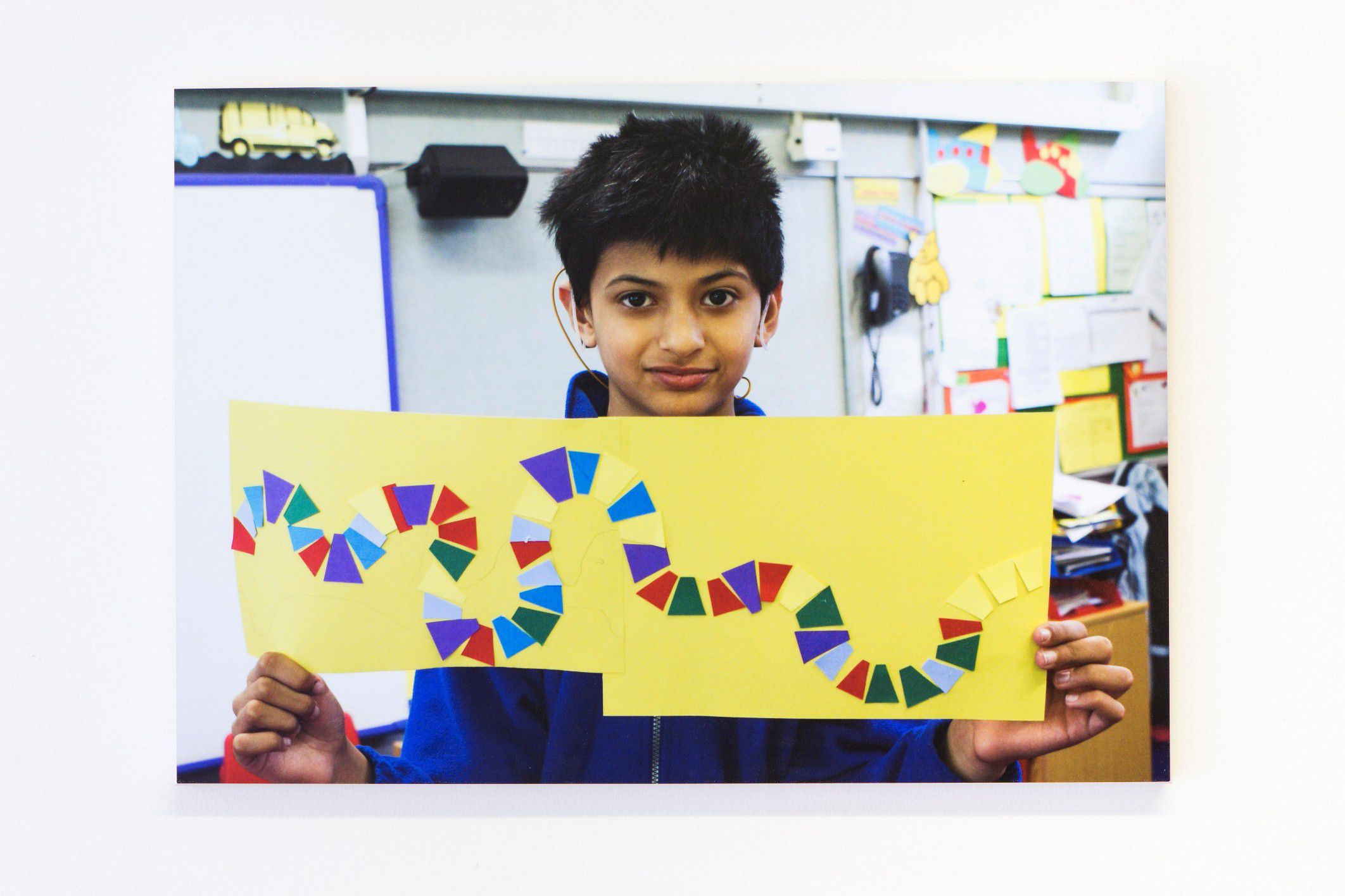 The workshops explored themes related to sound, form and colour. Sound wave patterns, graphic music scores and diagrams of the structure of the ear informed the children’s endeavours to render sonic rhythms in visual form.