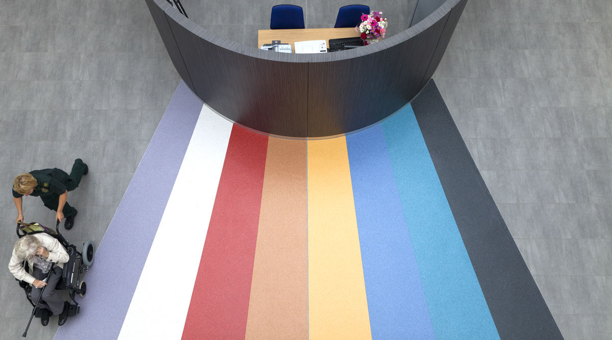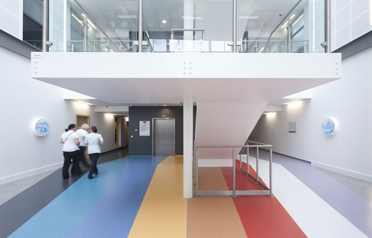 The artist’s commission for the building interior deals with colour in its fundamental and purest form. For the design the artist has employed 11 key colours: pink, orange, grey, blue, yellow, white, green, brown, red, purple and black which are deployed through the buildings key public circulation routes by using the hospitals flooring.