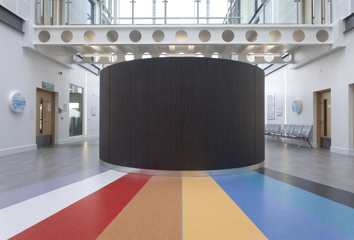 The design emerges from the ground floor reception desk as a prism of 11 colours, each leading to corresponding departments; these 11 colours equate to the 11 areas of the hospital, with the artist using different colour designs for each area with shapes and forms extending along corridors and wards.