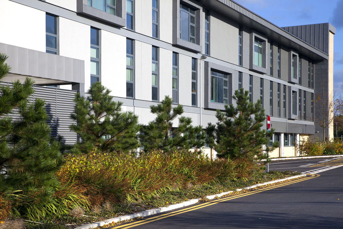 Estelle’s work implies light and shadow travelling the length of the hospital building which is achived with the use of the building paint. The conceptual logic is to propose that this movement from light to dark wraps itself around the building along each façade; light at one corner of the building to dark and then dark to light etc. The choice of grey was developed with the architect. It works with the materials already present on the building such as the brick and the zinc of the roof.