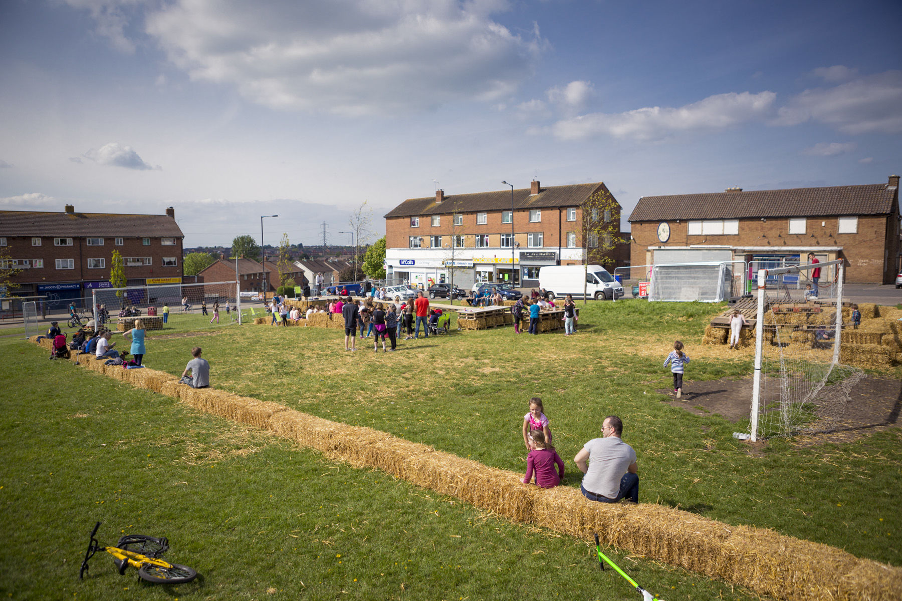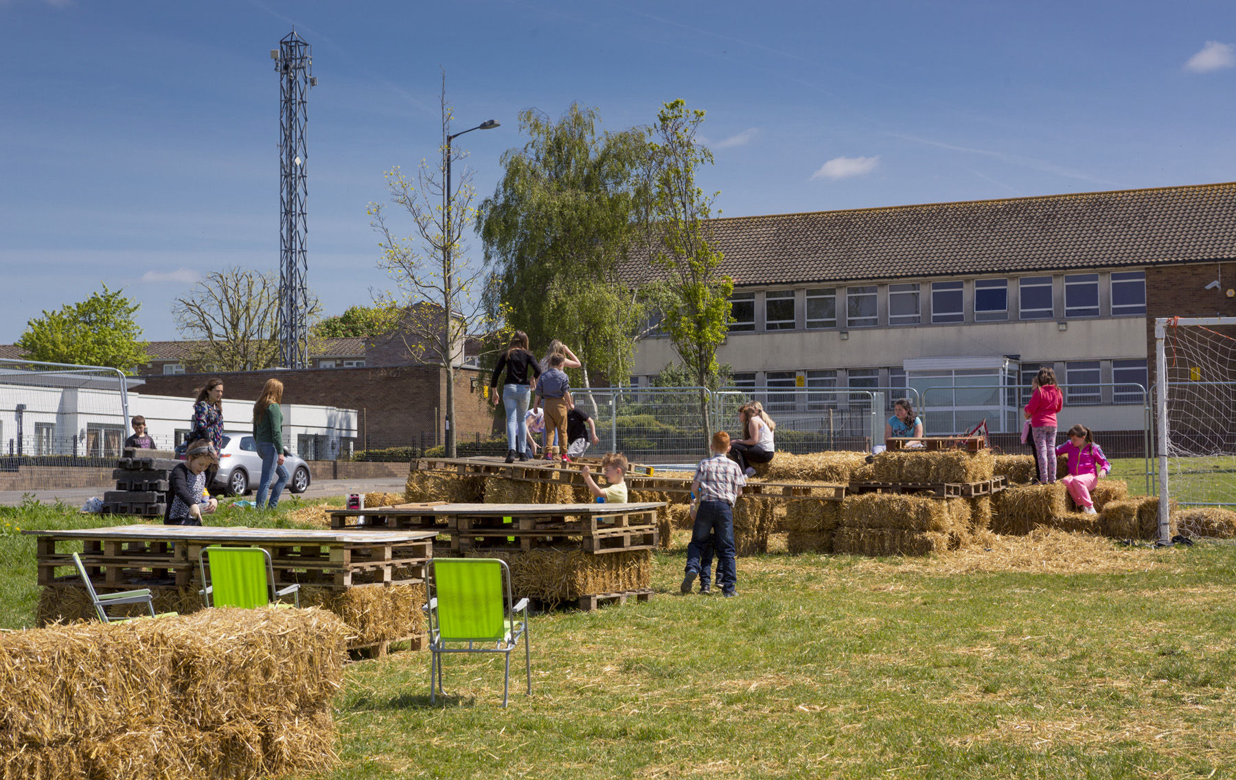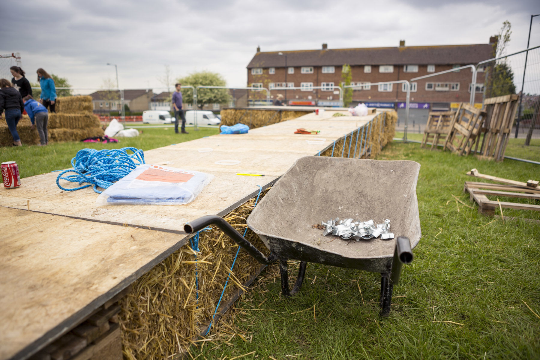 The starting point for 'Our Dream Today, Your Dream Tomorrow' was eleven workshops with young people developed in association with Learning Partnership West who provided an official ASDAN accreditation to participants. A simple ramp and stage was constructed from straw bales, timber and rope located along the edge of the grass football pitch. The structure was built by the project participants, along with artists, architects, designers, UWE architecture students and a structural engineers occupying a cordoned off green space at the heart of the Gainsborough Square construction site. The placement of the project allowed the public to encounter it within the unfolding landscape construction works, raising awareness in the activity and the Council’s work in the area.
