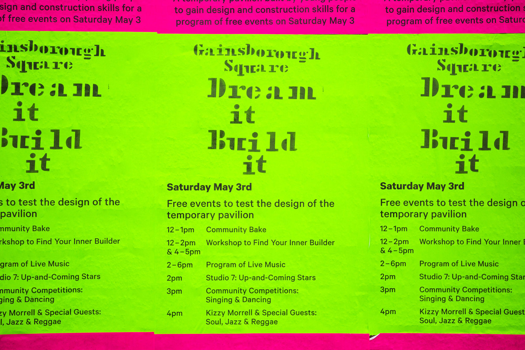 The second strand of the project took place during May 2014 in the form of a temporary intervention designed as a form of ‘action research’ and in order to test ideas for the third and final strand; a permanent pavilion for Gainsborough Square. Entitled ‘Our Dream Today, Your Dream Tomorrow’ muf’s project was a temporary structure designed and built with local young people. Co-funded by BCC’s Economy, Enterprise and Inclusion team the project was focused on work with NEET’s (Not in Employment Education or Training) to foster an interest by young people in design and construction skills. By working with artists, architects, structural engineers and a graphic designer the project offered its participants an understanding of what it takes to build something in the public realm, team work, the differing aspirations of the local community, and how these aspirations can be evaluated to inform the design of the public realm.
