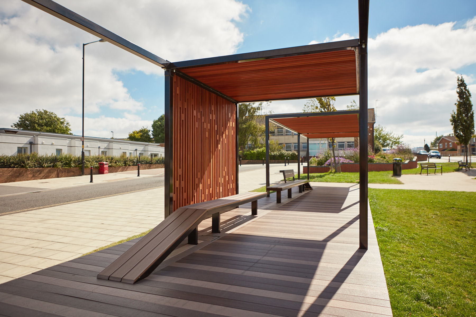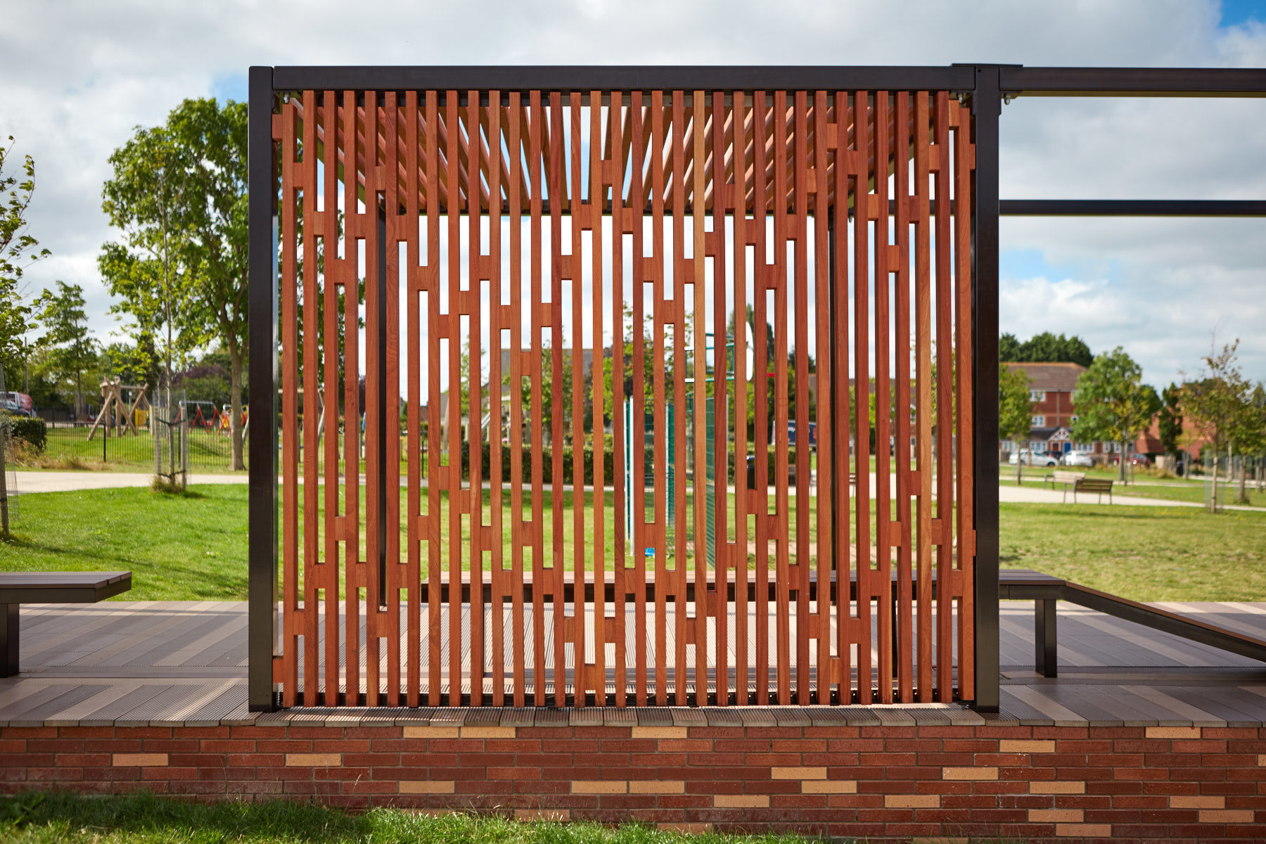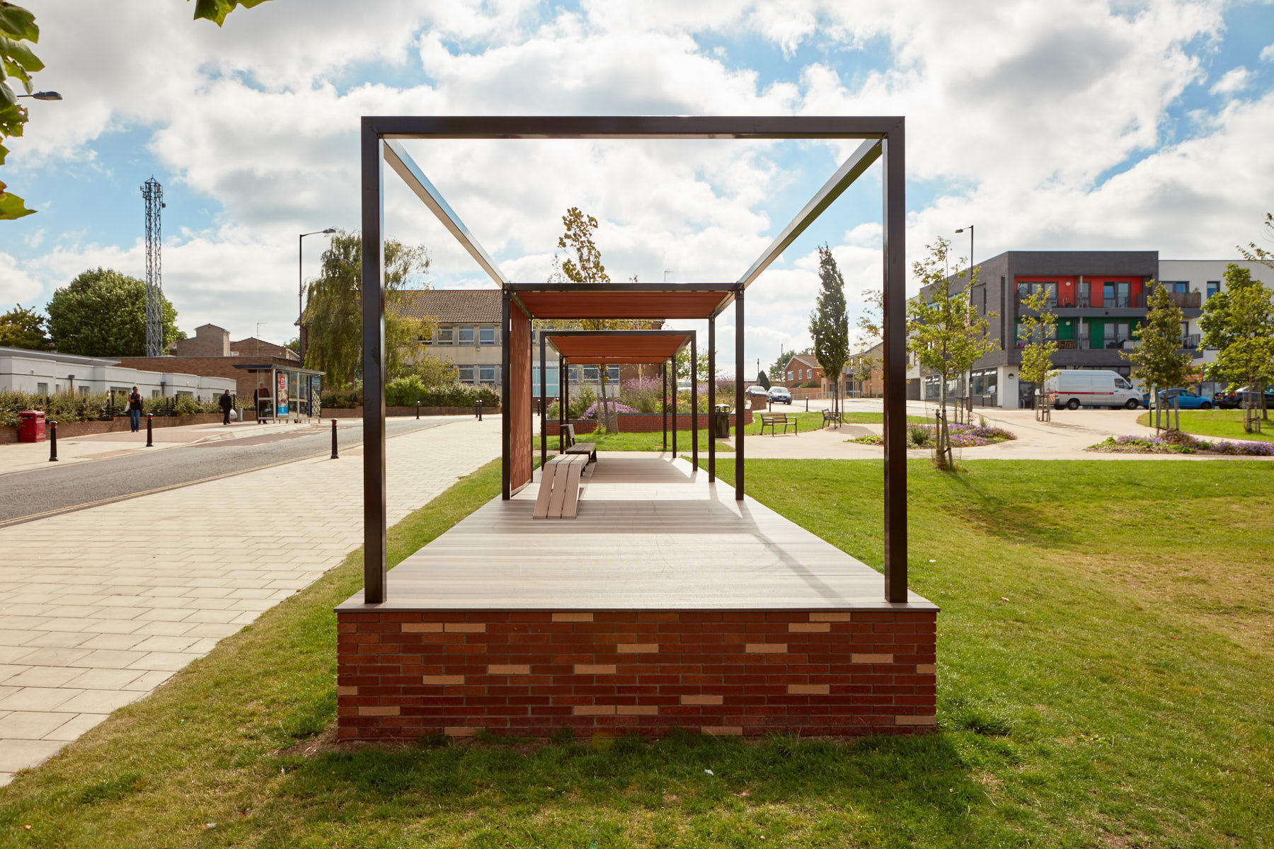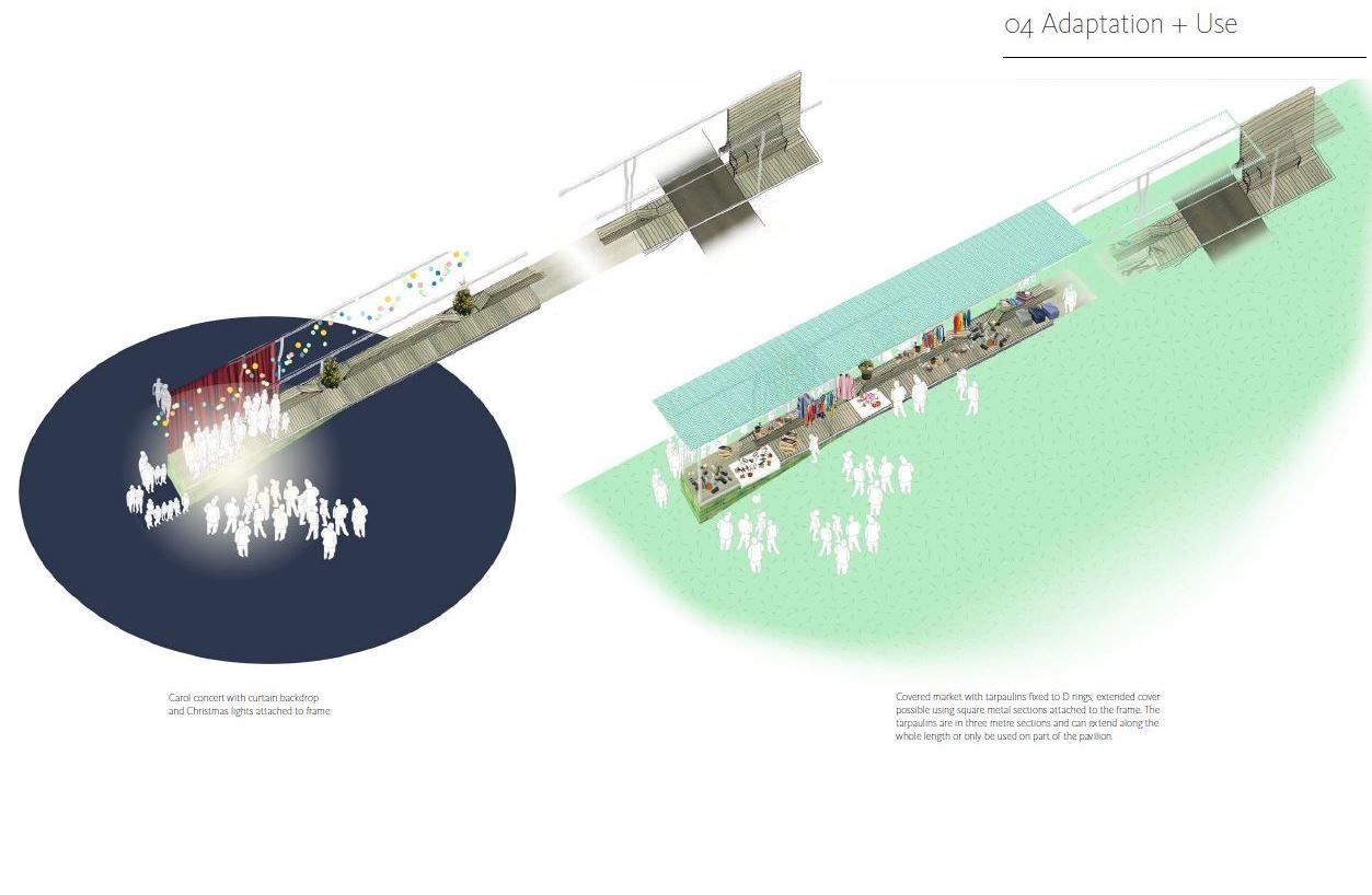 Muf’s permanent pavilion design builds on the knowledge gained from the consultation and action research. The pavilion which was completed August 2016, is formed from a simple orthogonal frame and deck to create a promontory space, extending some 25 metres and aligned with Gainsborough Square’s retained games area. The pavilion comprises two spaces with wind break walls and louvered ceiling, one with a conventional bench with a high back and arm rest, the other with a long low undulating bench. The pavilion frame is designed with fixings so that tarpaulins can be attached to create a covered market / event space, together with a power supply for community film screenings, lights and other events. The materials and detailing are simple, low cost, robust and elegant. The clean and simple form of the pavilion allow it to be easily adopted and adapted for different activities by the community for whom it was designed.