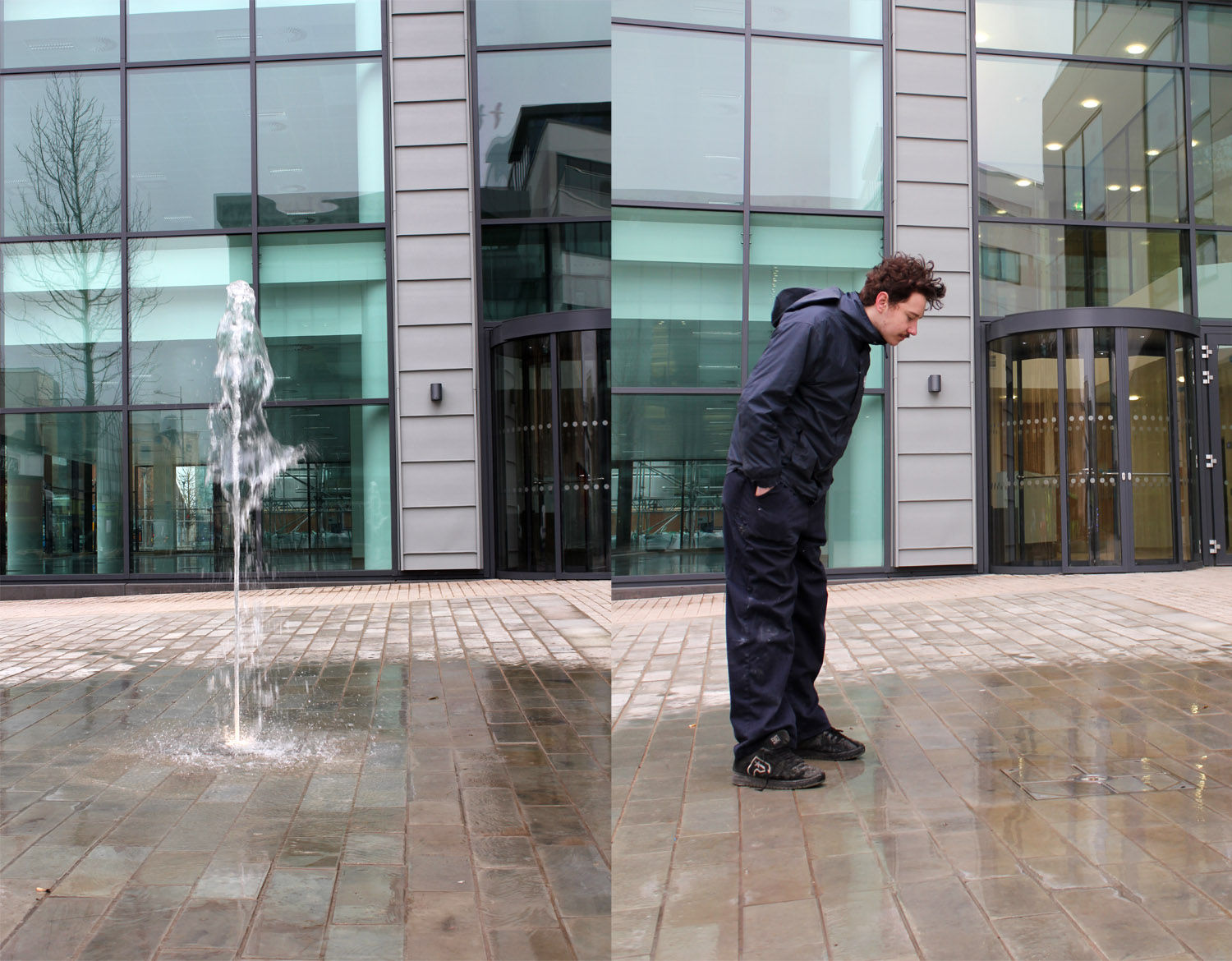 The work is controlled by a series of movement sensors which create a space that is sensitive and reactive to motion. When no one is there (and therefore no movement is detected) the fountain reaches a maximum height of 1.3 meters. When any of the sensors detect movement, the fountain shuts off abruptly. After a short time the fountain slowly re-emerges, getting progressively higher till it reaches its full height once more. Unless, of course, more movement is detected, at which point it abruptly disappears again, leaving only the wet stone as a trace of its recent presence. If however, the viewer sits still next to fountain they can observe the fountain slowly get bolder and witness a secret spectacle