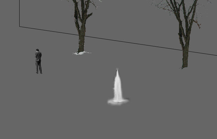 Comprising a very simple design the Shy fountain has been created to roughly suggest the silhouette of a small person. A single jet of water shall emerge directly from the street paving, and fall back against the stone flagging creating an audible splashing sound. The nozzle of the jet from which the fountain emerges is hidden in the surface for the stone so that when the fountain is not on it will leave no visible trace other than a patch of recently wet paving.