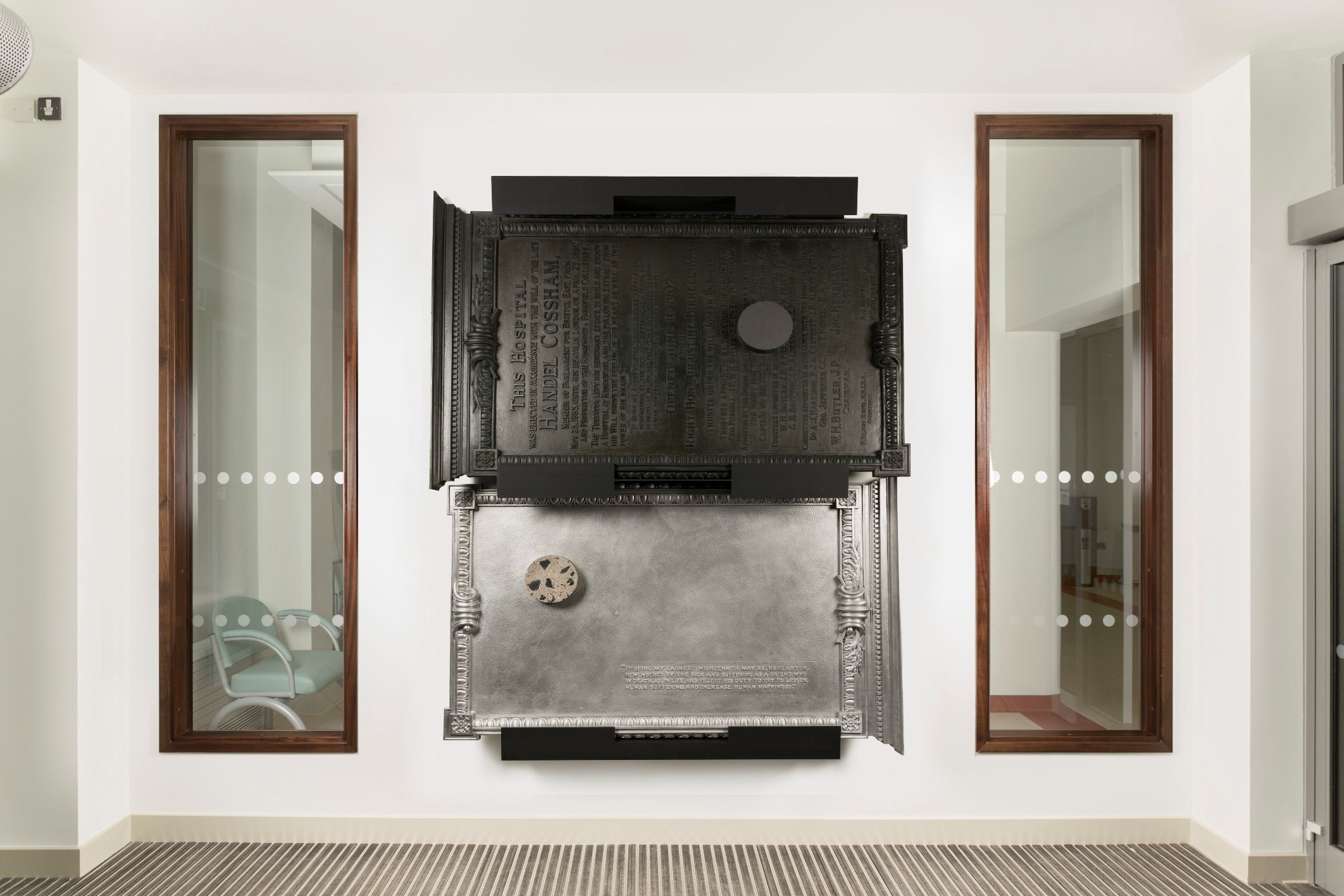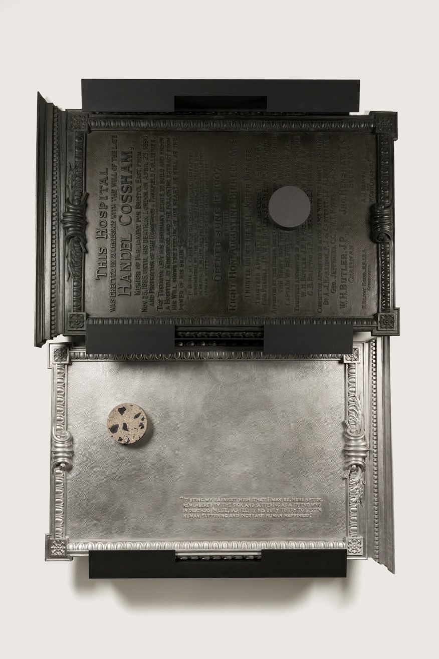‘Charter’ is made up of two new versions of the original memorial plaque, each cast in a different material and set within an armature designed by the artist: one in aluminium and another in carbon fibre. The sections are punctured with a large circular plug made from a composite materials using coal, concrete, lead shot and silicon. The materials used have been chosen by Claydon for their symbolic value referencing the sites history, building materials, and its recent development.