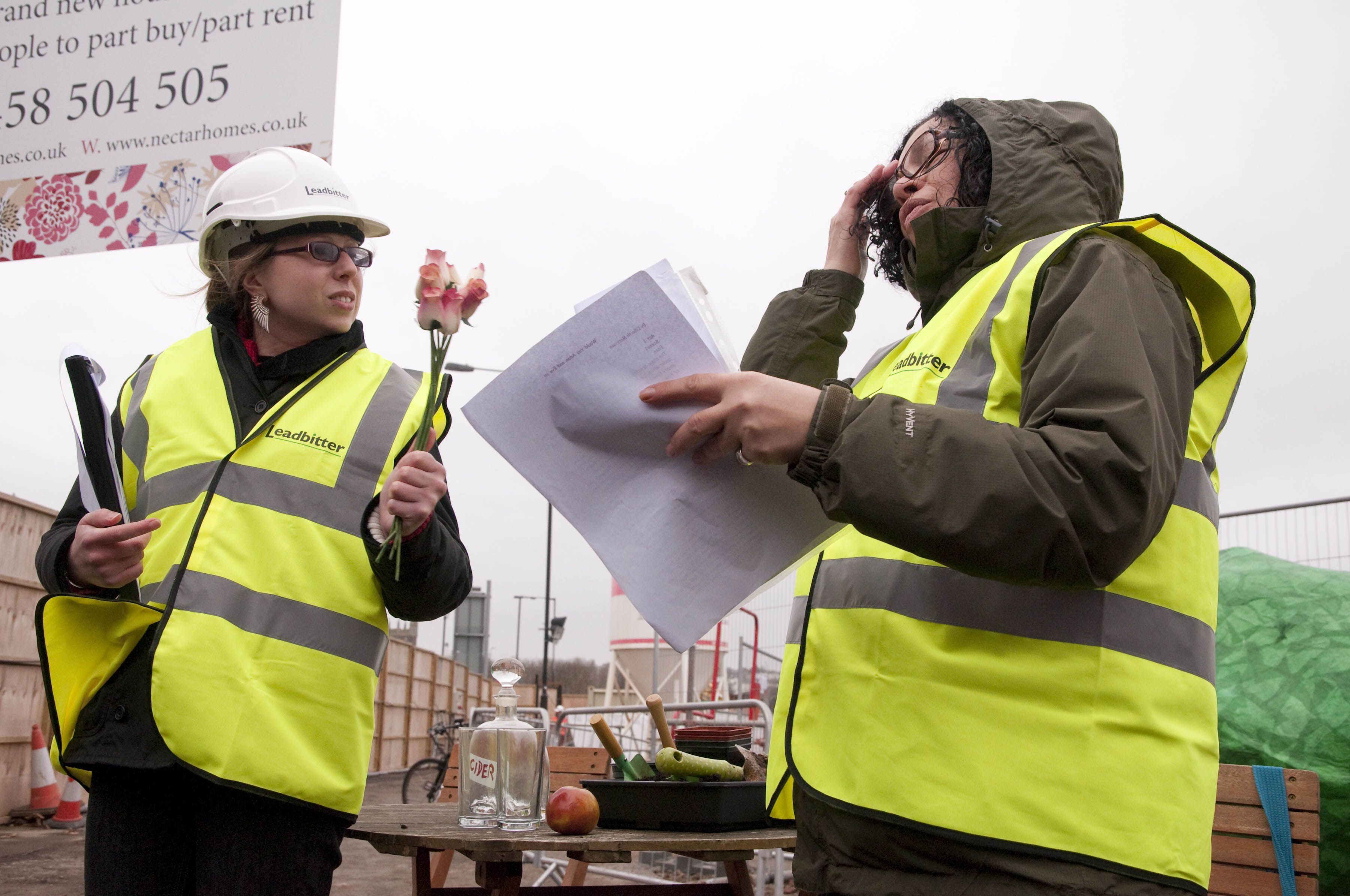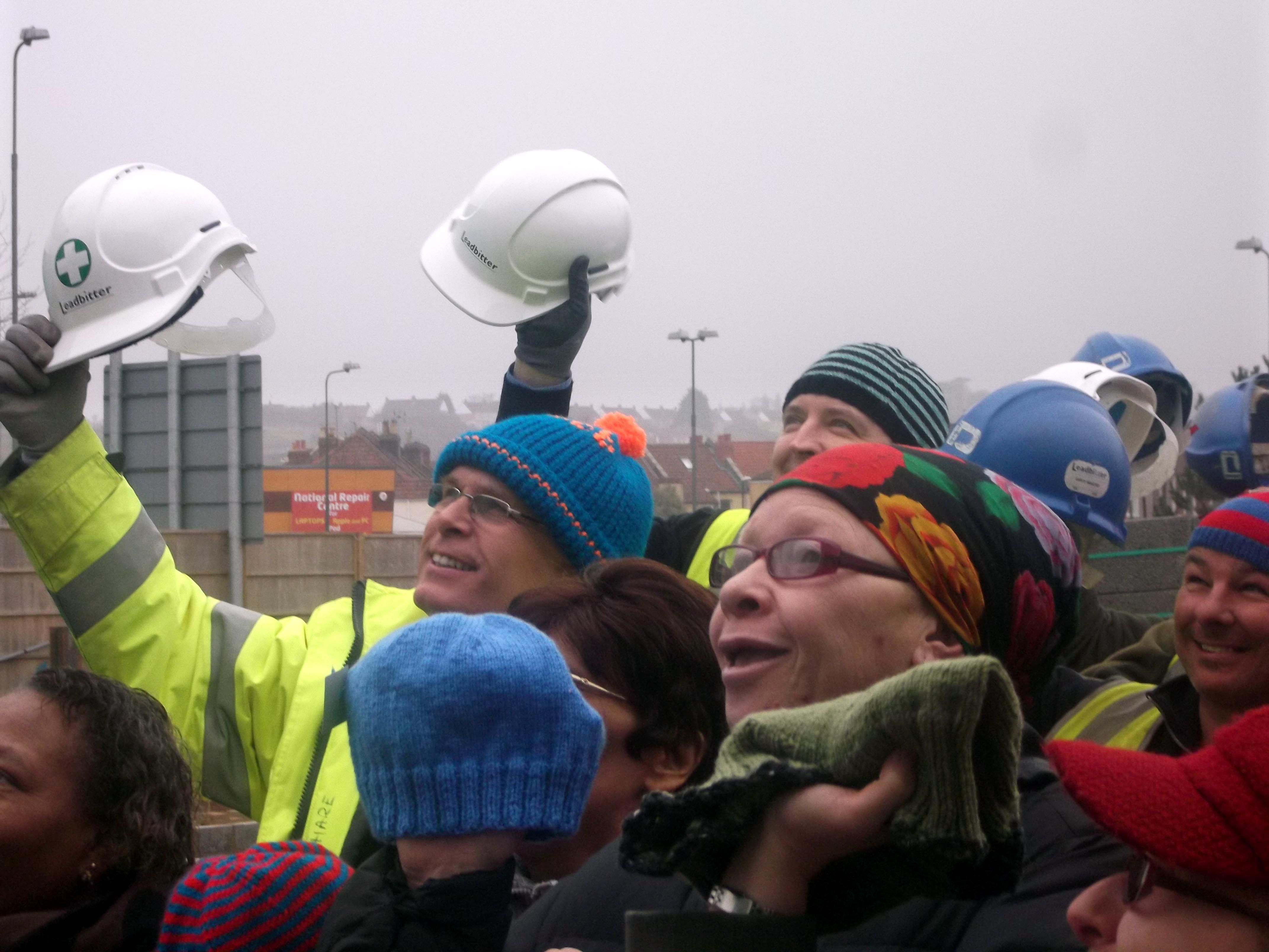Events included ‘Tented City’ in 2010, in which the artists and enthusiastic volunteers from the local community created a dawn till dusk installation consisting of a group of tents on the land to be developed before building work began. Approximately 700 people visited over the course of 18 hours and the event sparked people’s curiosity and encouraged the development of a strong sense of community. For ‘Hats’ local residents were asked to knit a hat for construction workers on the site. A variety of other events, based around interests such as sport and music and involving construction workers and local groups, including a local primary school, took place during 2011 and 2012. Davis and Jones worked with First Born Creatives to create a film documenting the events which will be shown at the opening of Junction 3 in the spring of 2013.