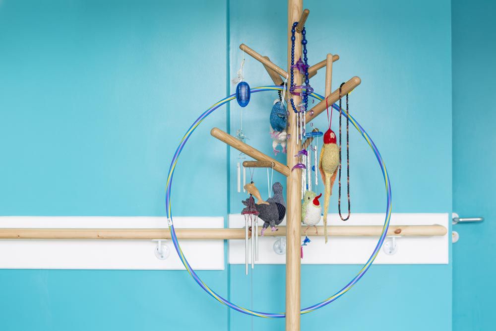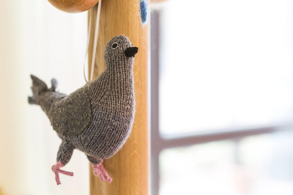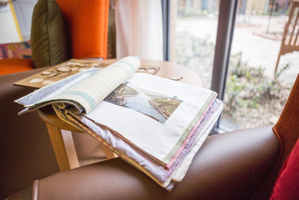 The work she created in response is both interactive and tactile. Exploration of visual and tactile stimulus lead to the development of fabric ‘sample’ books and a migratory flock of textile birds, both of which can travel throughout the space with residents, or be held and touched by residents who are less mobile. The flock of birds has been created using soft natural yarns (silk, cotton, angora and wool) and embroidered to provide detail and additional tactile surfaces. Their colour and markings relate to species found in Jamaica, Punjab, Somalia and other countries relevant to the residents in the Bristol home.