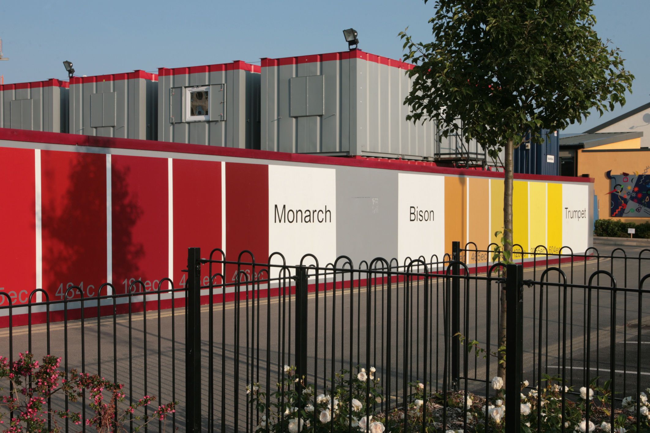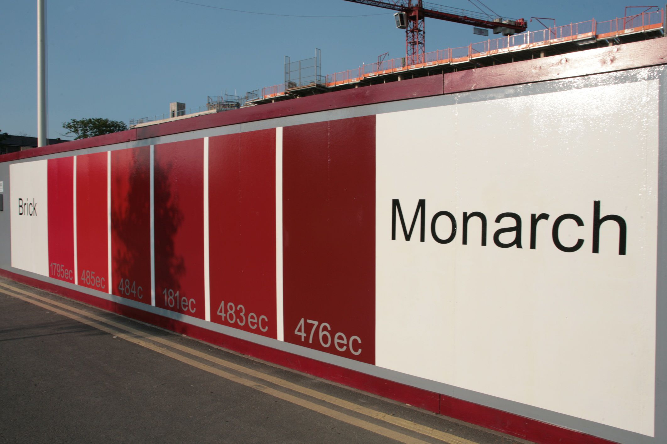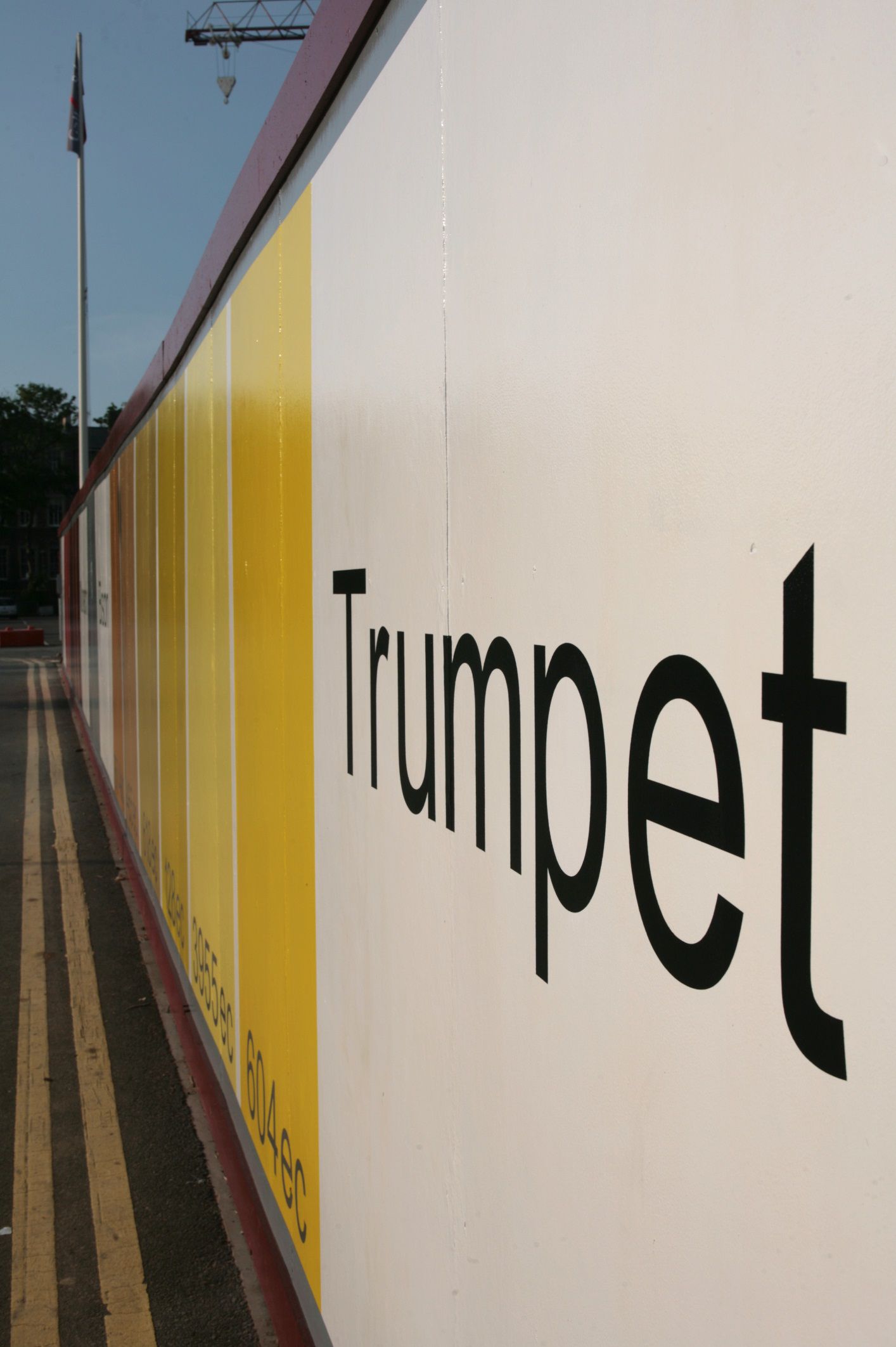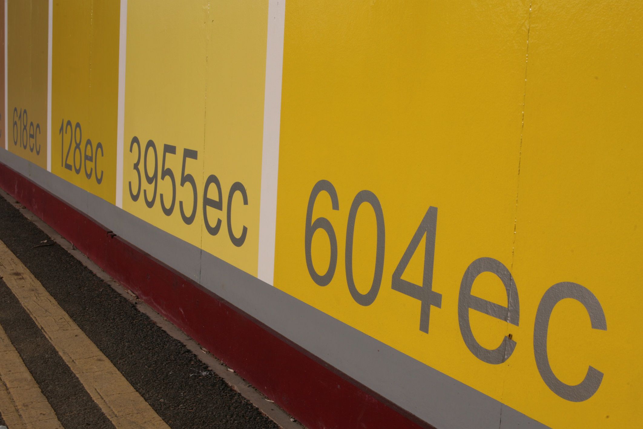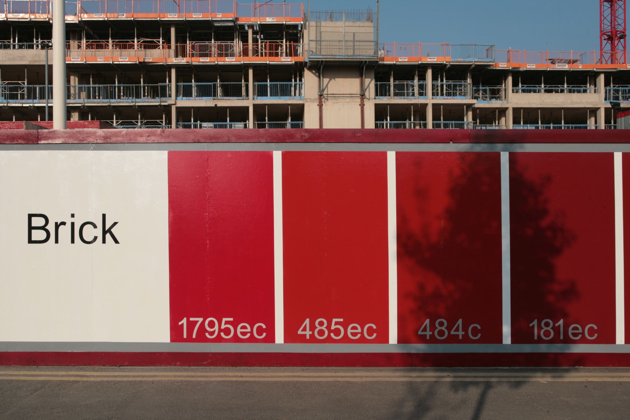 Completed on June 14th 2013, Bison-Trumpet consisted of three giant colour swatches, which were designed to cover almost 40 metres of hoardings. Based on colour samples taken from the site, each of the swatches contained six colours chosen by the artist. These colours were then matched to commercially available paints, to speculate or propose absurd connections between the sometimes poetic and sometimes baffling names given to paint colours by their manufacturers. Why a certain shade of brown evokes ‘Bison’ or a specific shade of yellow suggests ‘Trumpet’ is, its seems rarely explained, which the artist used to examine and highlight the tentative ways in which we speculate on the connections between ideas and objects and the systems of categorization and definition we use to arrange knowledge.