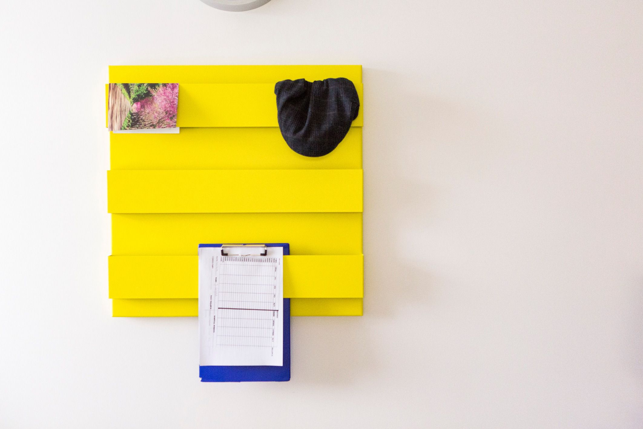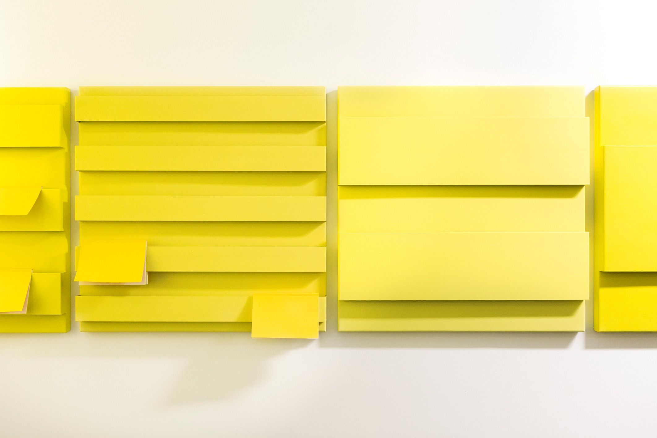 Hutchison’s project embodies this complex tension. Five quasi-functional objects are designed with vertical shelves, dictated by health and safety protocol. Their yellow hues are selected in collaboration with a clinical psychologist, to reinforce mental wellbeing. To this end they meet the terms of the commission. Yet they remain ambivalent: Are they more shelf-like or sculpture-like? More design object or art object?