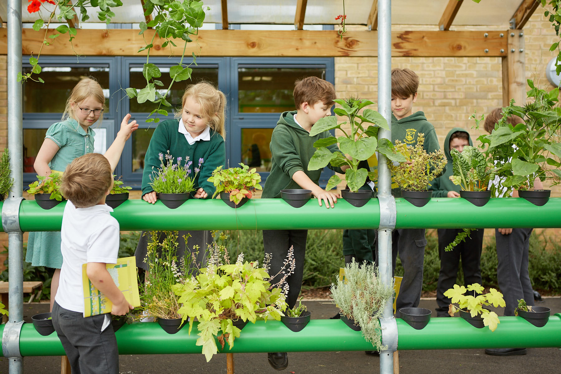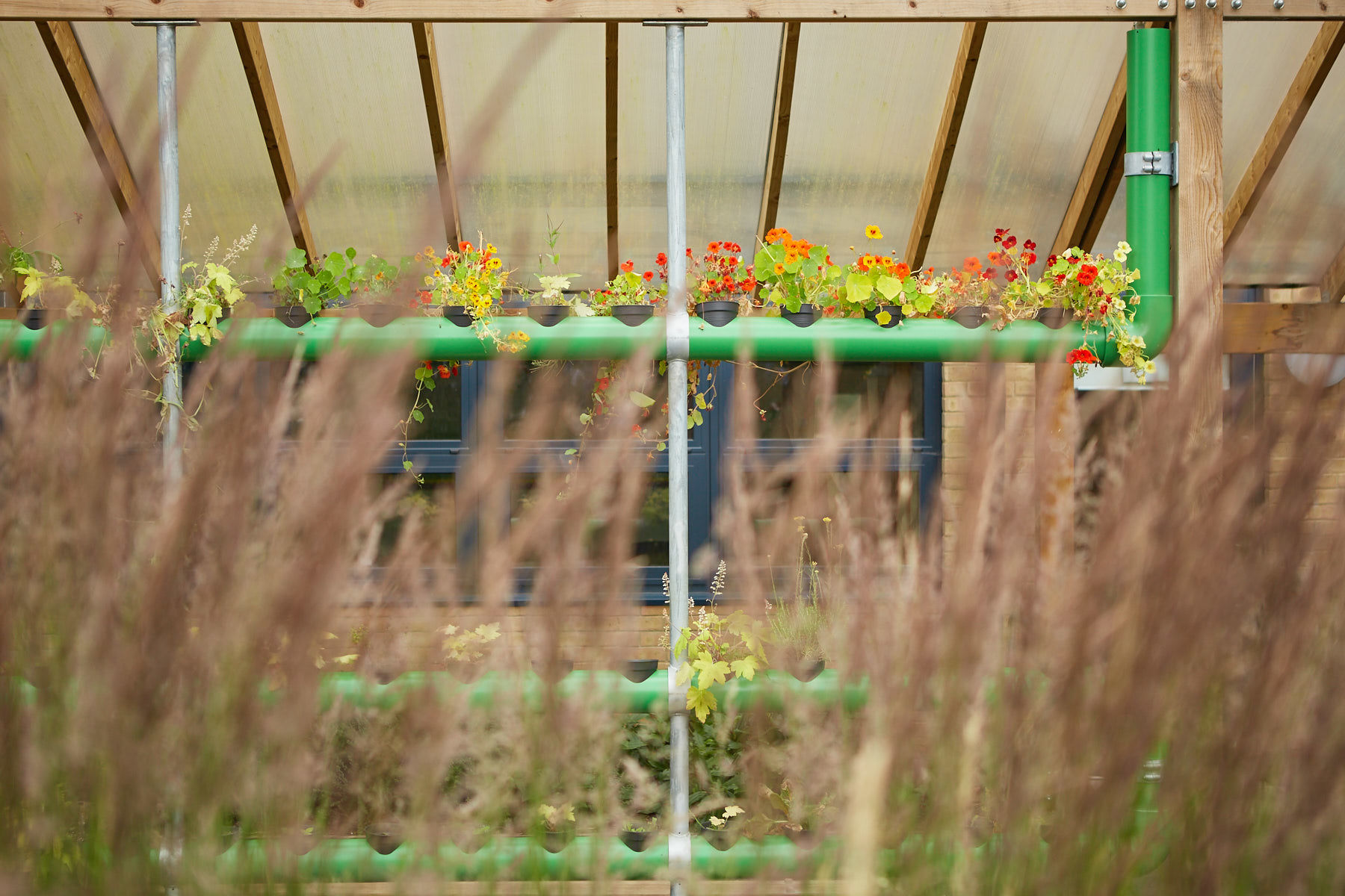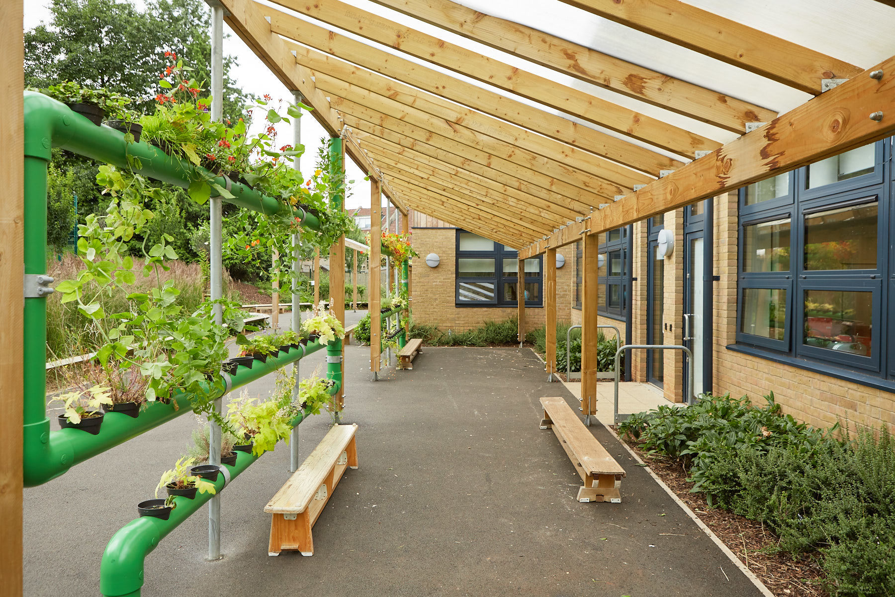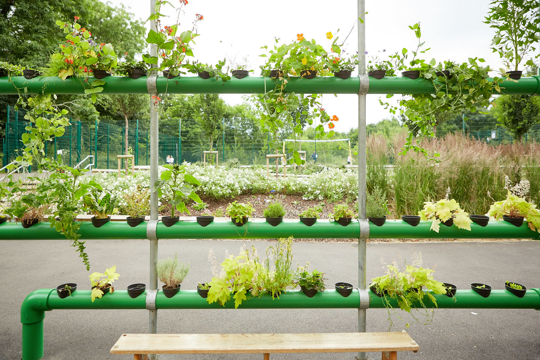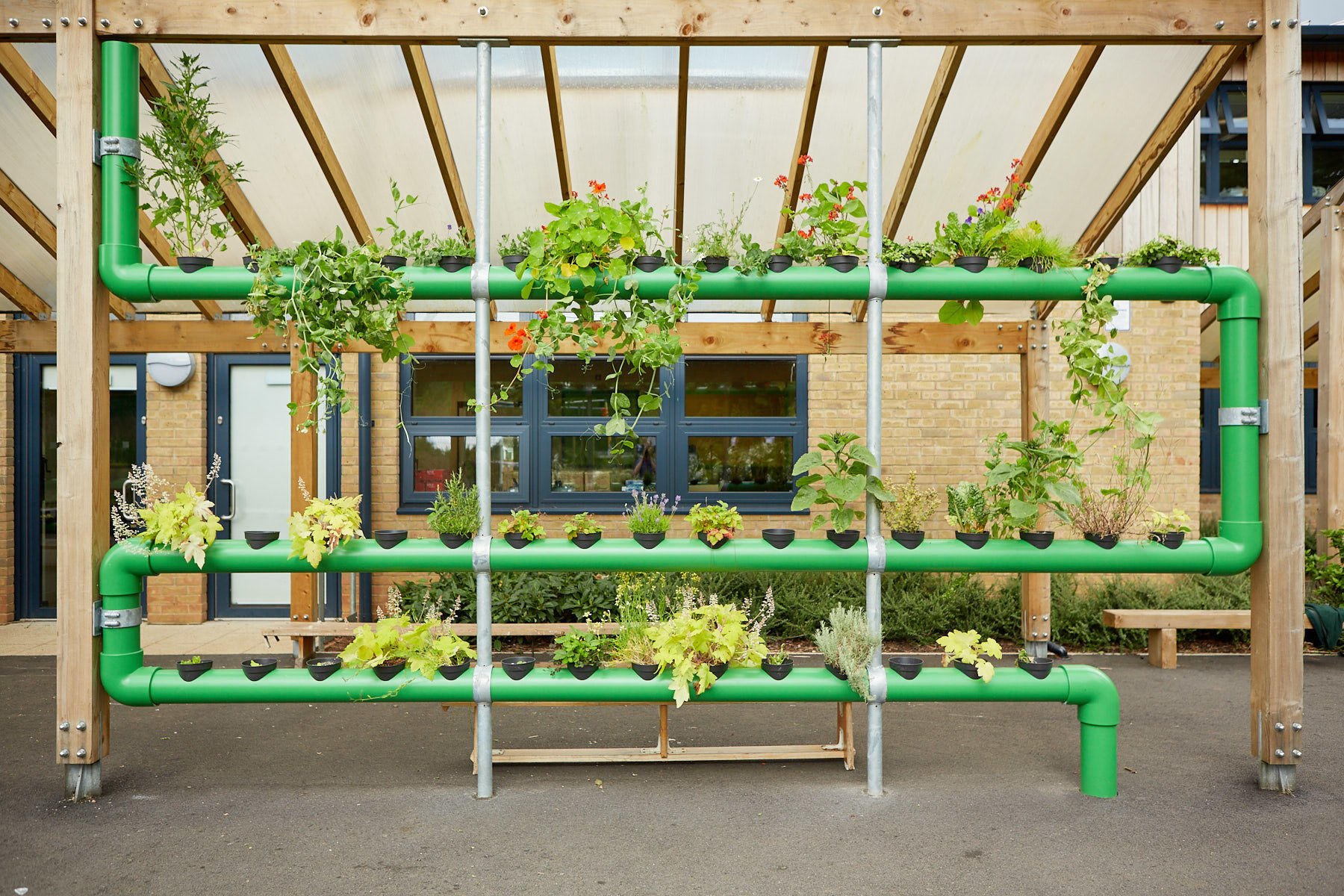 For the St Anne’s commission, Eudaimon created ‘The Cascading Garden’ an artwork that exists at both St Anne’s infants at Bloomfield Road and Junior school at Lichfield Road. The work comprises of an exterior planting systems integrated into the architecture of the schools exterior spaces. Zigzag in form these hydroponic structures are made up of horizontal and vertical cylinders which are interspersed with a series of circular holes for plant pots in which plants can be grown. Much like a marble-run game, pupils are be able to sow seeds up and down the structure, watching the growth of plants and the resultant changes to the sculptural form.