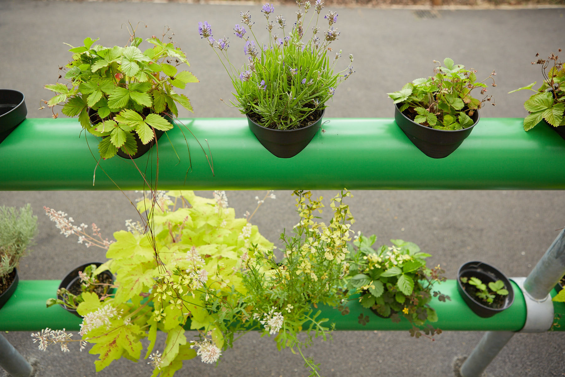 The cascading garden is watered by a sub-irrigation system that is controlled by ‘float switches’. When the water level in the system is too low or too high the switches triggers an electrical current to tell the solenoid valve to release more water into the system or to stop the flow of water. The plants in the system are able to access water whenever it is needed by Capillary Action through a wick at the base of each pot that is immersed in water, allowing the plants to absorb water when they need it.