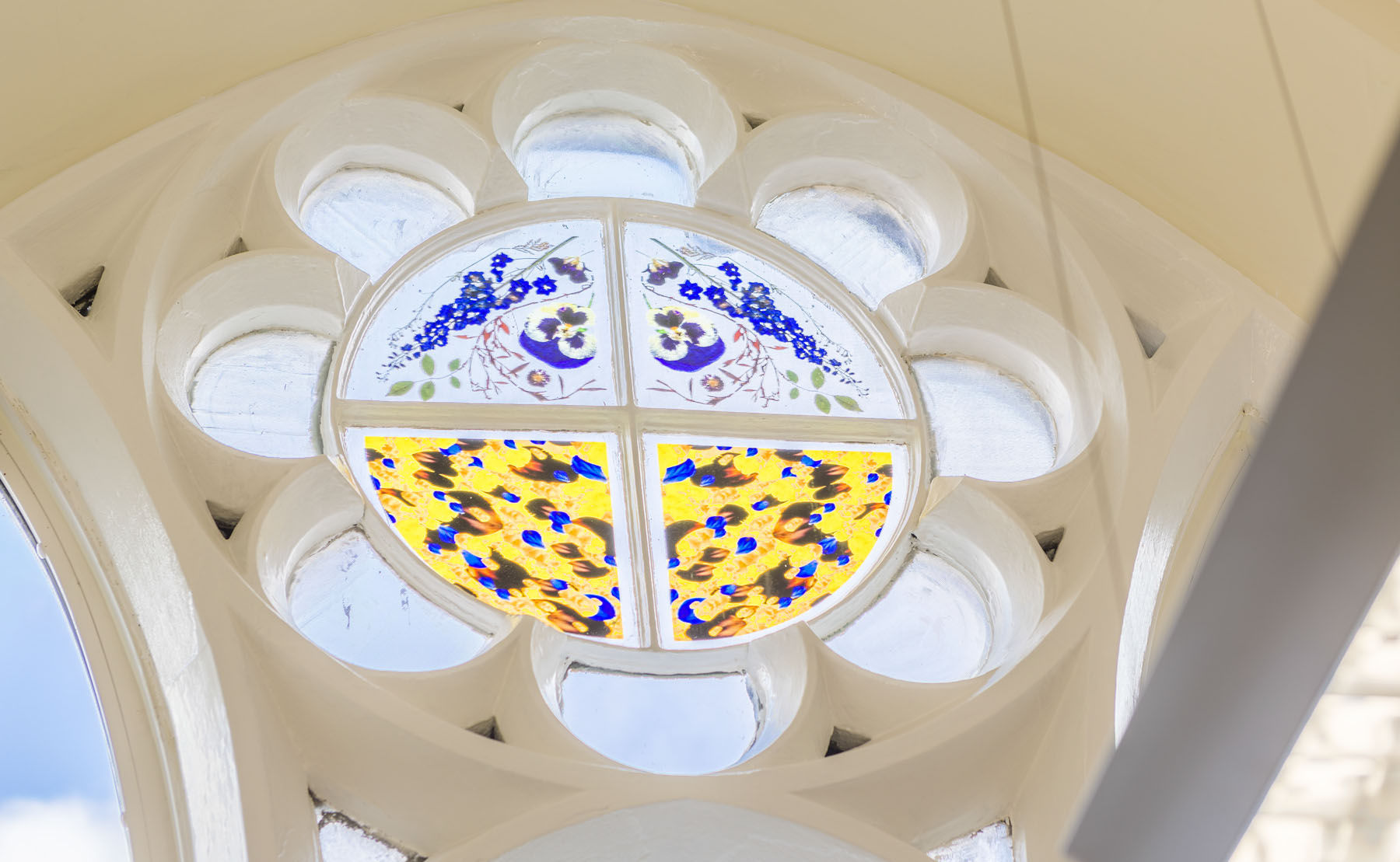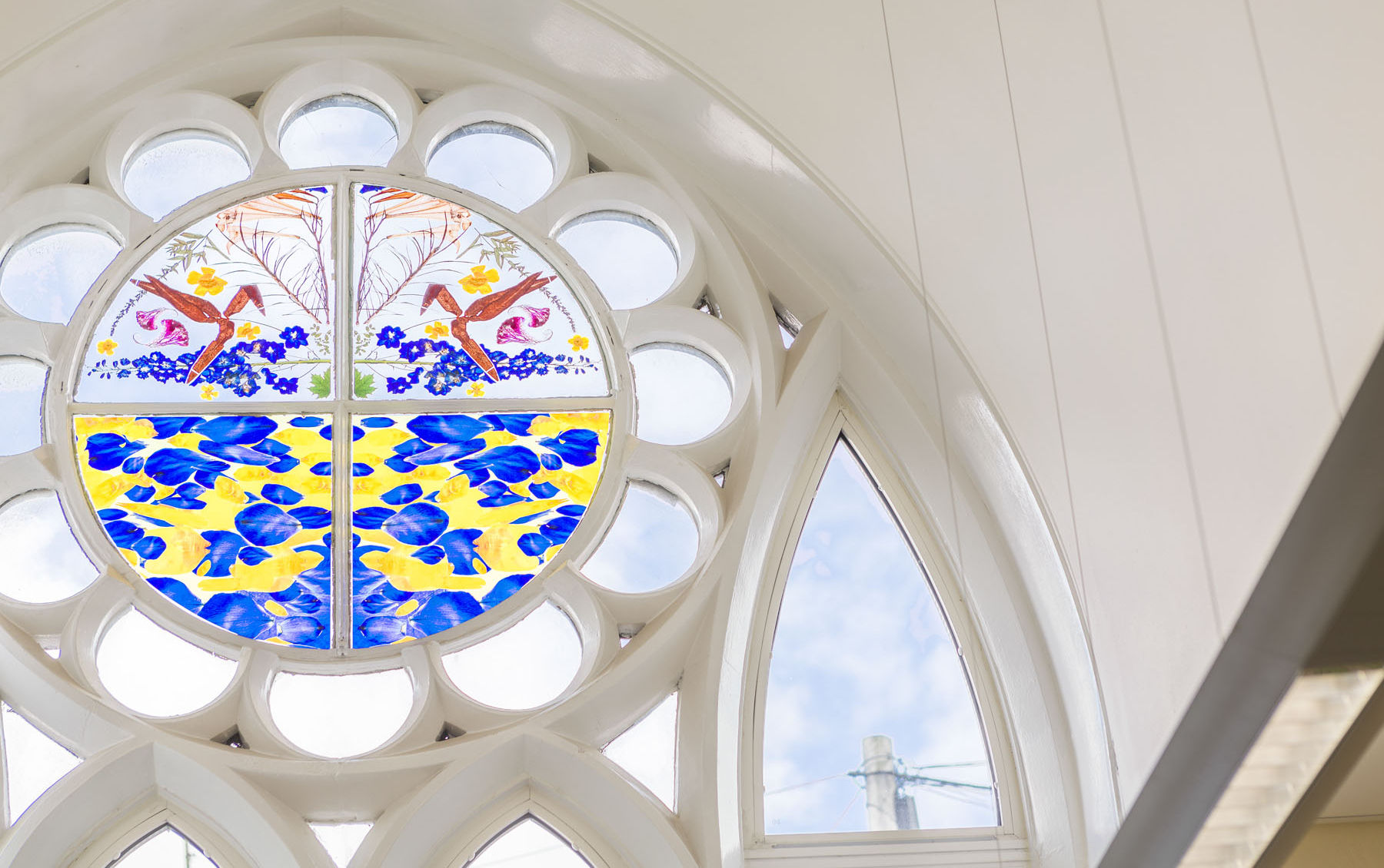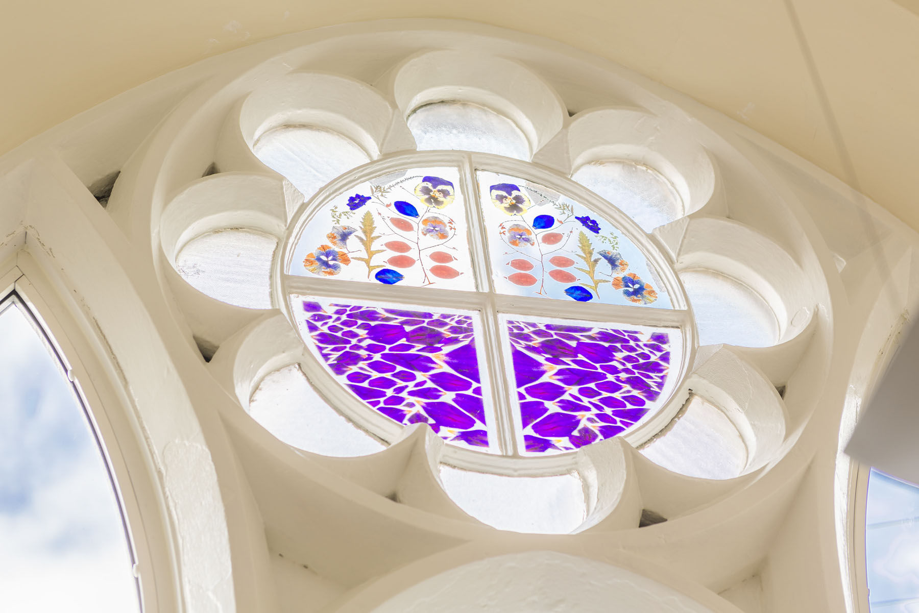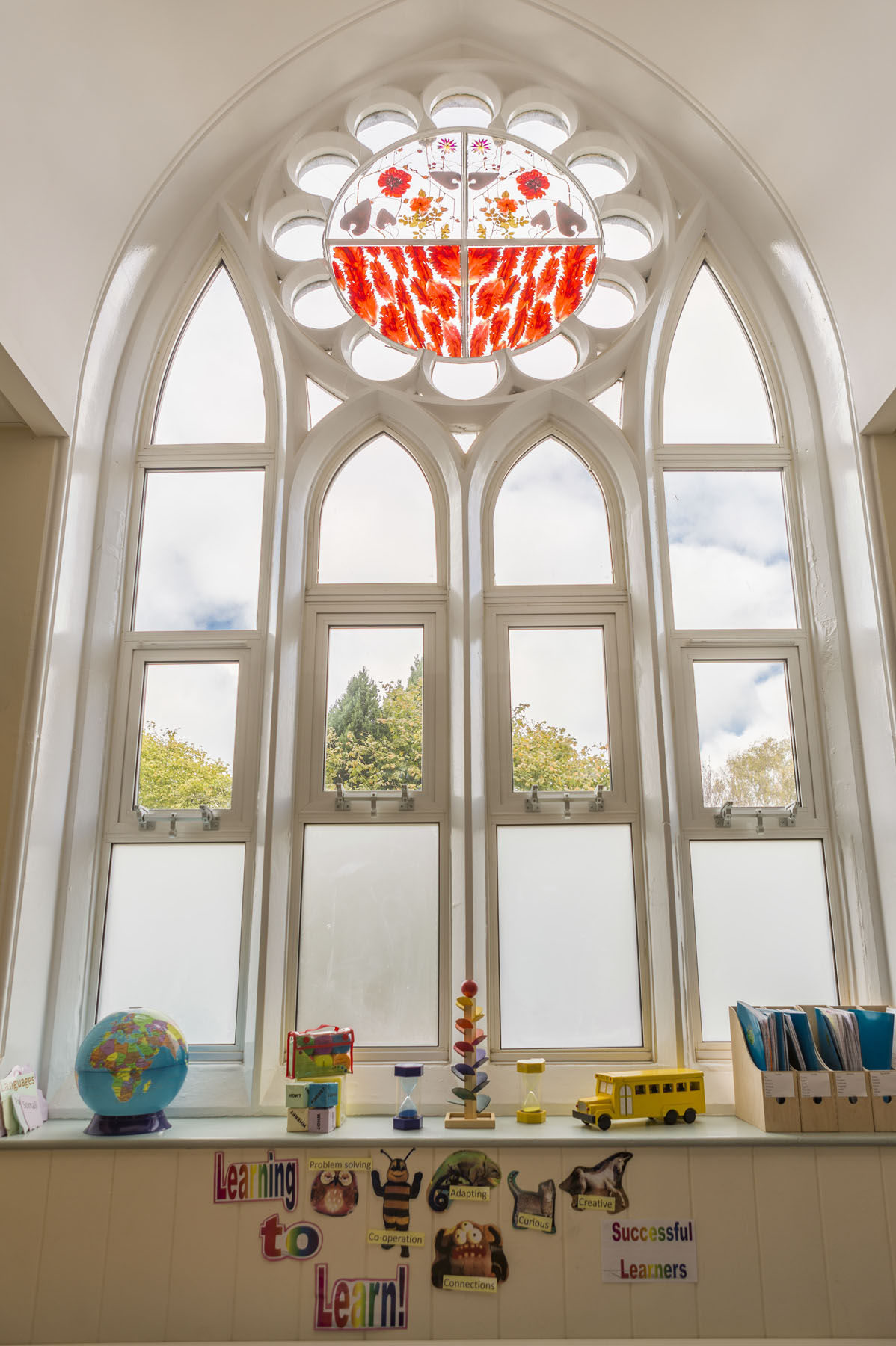 For St Werburgh’s Jennifer developed a suite of glazed window designs for the existing period windows that feature across the Cutler’s Brook annex site. In developing the work the artist investigated stained glass, stencilling and printing techniques that were deployed within the final artworks. A key point of investigation for the work was the school’s ‘Forest School programme’, an area of the curriculum that Head Teacher Claire Smith is particularly passionate about, along with Botanical illustrations which are themselves a recurring natural motif in Tee’s work, featuring in her recent commissions for ‘The Marque Public Art Commission’, Cambridge, and ‘Central Station’, Amsterdam’, both of which involved extensive research into flora and species at the University of Cambridge Herbarium and National Herbarium of the Netherlands.