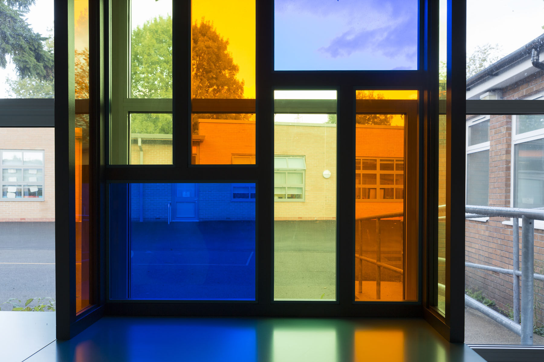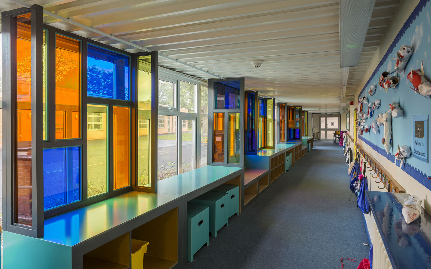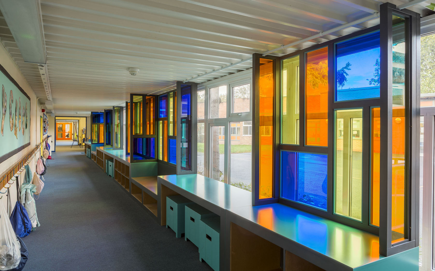 For Avon Primary Houlding Houlding created a work for one of the schools main corridor spaces in the older part of Avon Primary. His aim was to create a new mood and a new rhythm that works with the length of this space, creating something which was both visually stimulating and functional. Employing tables, storage and seating solutions the modular artwork fills the space an animates it. Coloured Perspex panels provide screens to the windows that flank the corridor which react with the external light, creating a tropical glow that is engaging, uplifting and positive. The mood intensity alters in relation to the light intensity from outside. Houlding’s work adds a regulated and modern feel to this space, providing storage space, along with seating and table space for pupils to use and work, bringings together architecture, design and sculpture.