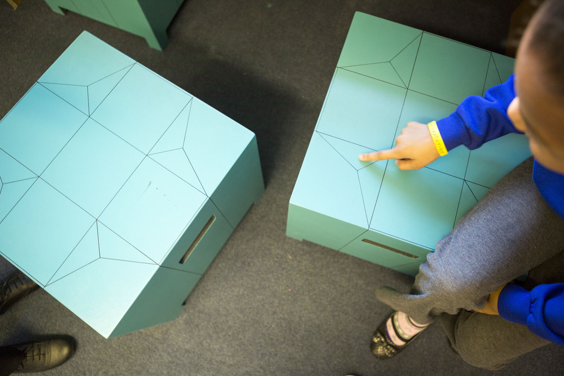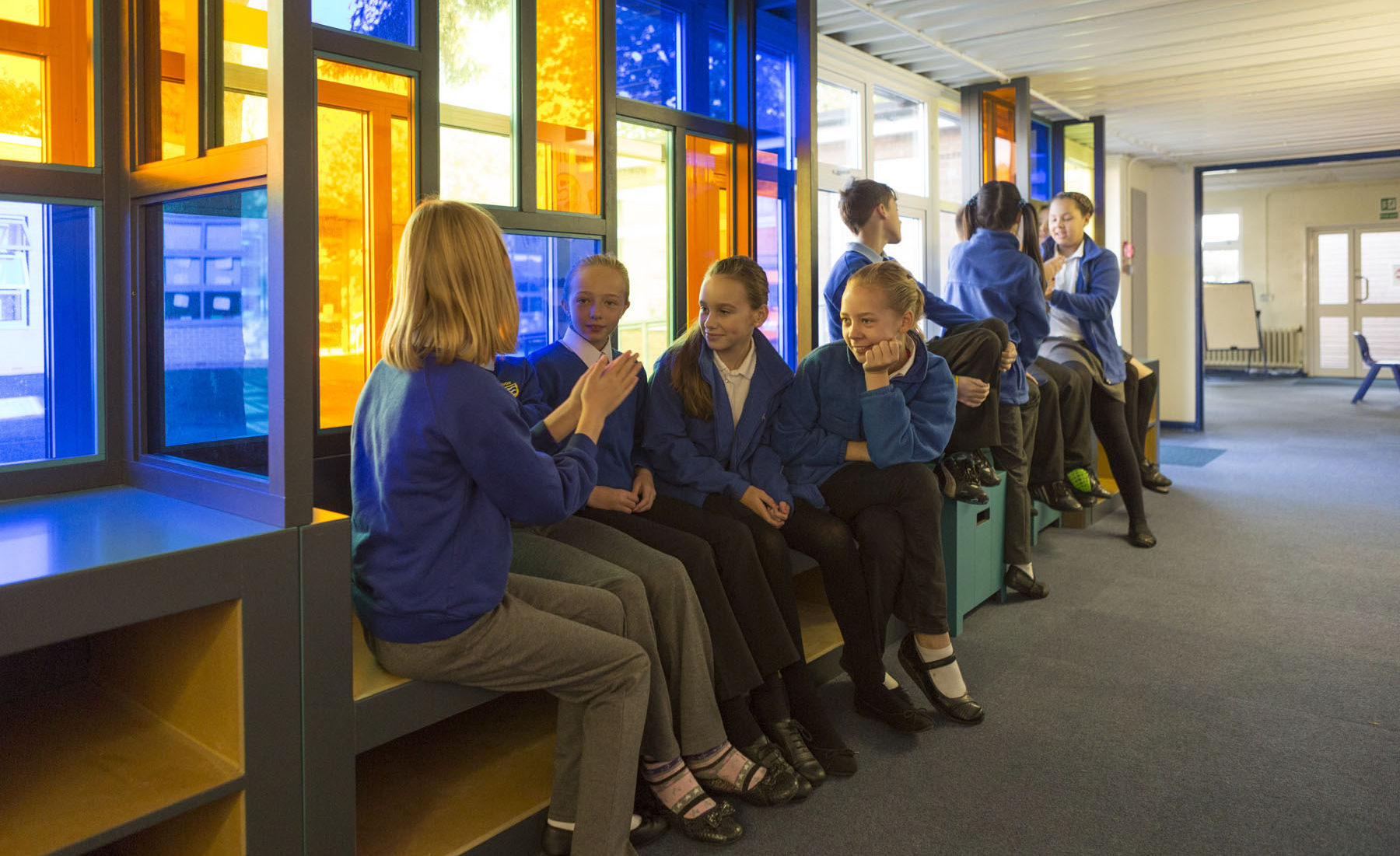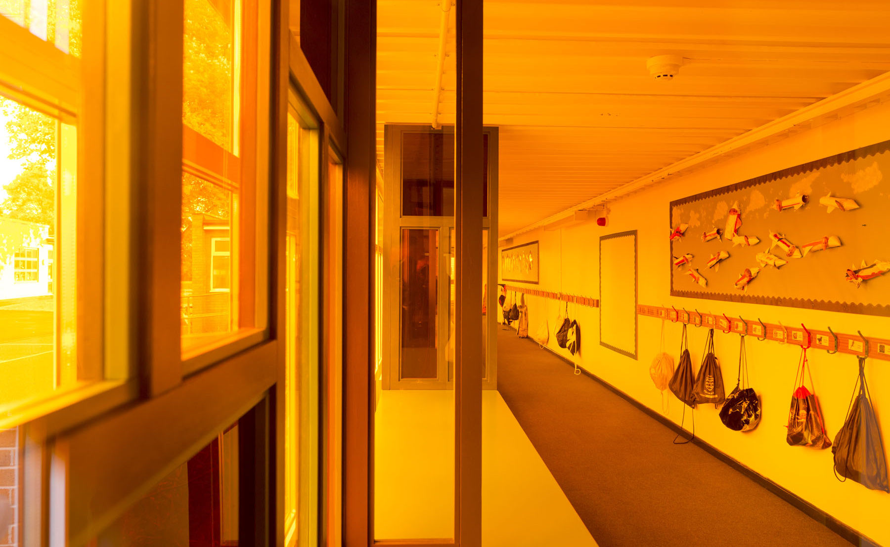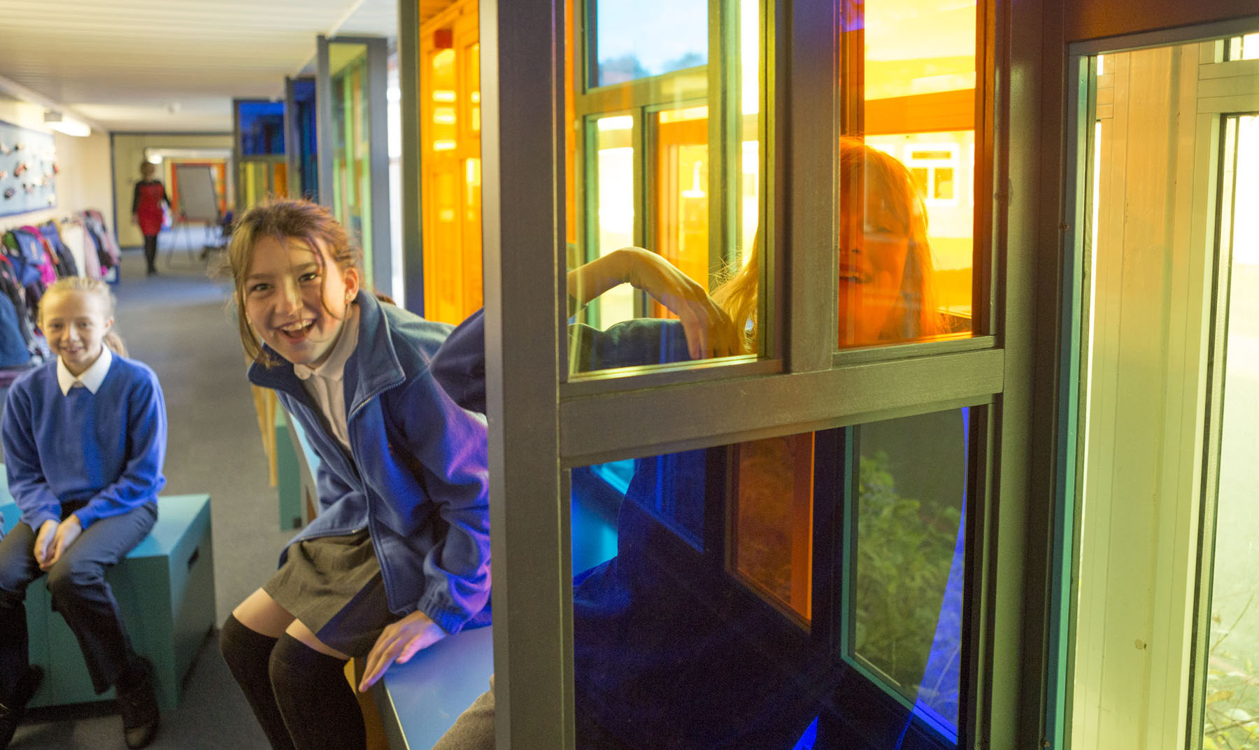 For Avon Primary Houlding Houlding created a work for one of the schools main corridor spaces in the older part of Avon Primary. His aim was to create a new mood and a new rhythm that works with the length of this space, creating something which was both visually stimulating and functional. Employing tables, storage and seating solutions the modular artwork fills the space an animates it. Coloured Perspex panels provide screens to the windows that flank the corridor which react with the external light, creating a tropical glow that is engaging, uplifting and positive. The mood intensity alters in relation to the light intensity from outside. Houlding’s work adds a regulated and modern feel to this space, providing storage space, along with seating and table space for pupils to use and work, bringings together architecture, design and sculpture.