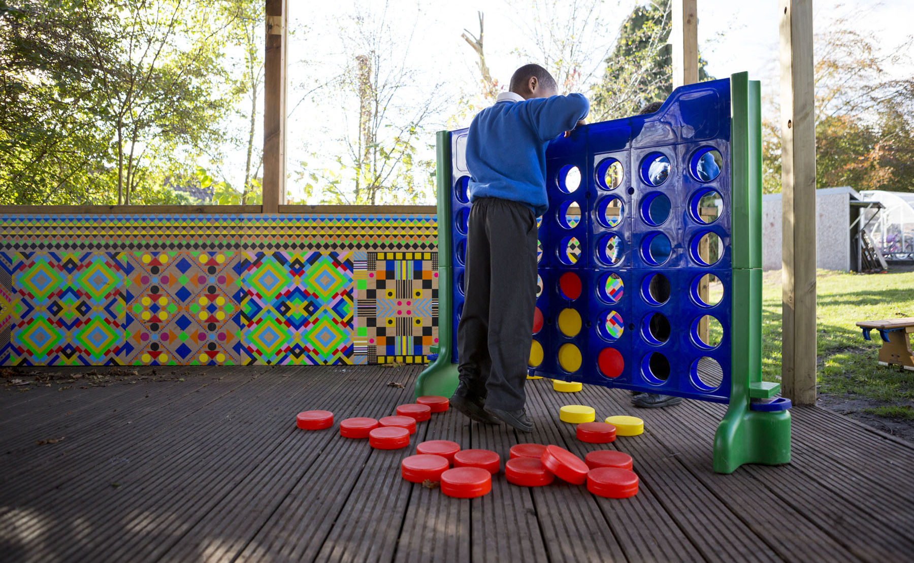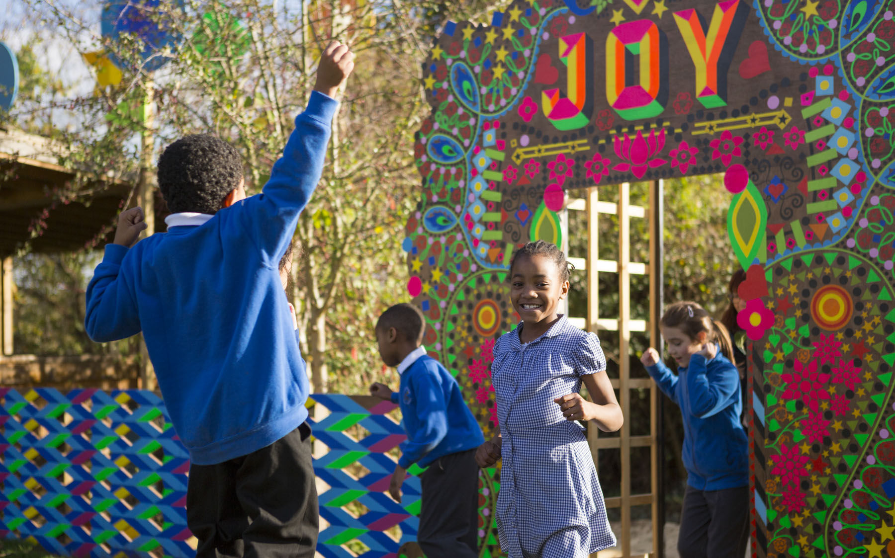 Linking the main pavilion to the adjacent garden area and growing area, Myerscough’s design employs her trademark graphic design and bold colours which are used to unify this area of the school.